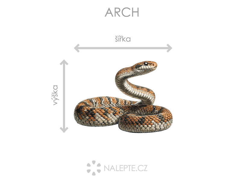 Arch = Arch si môžete prehliadnuť vo fotogalérii. Rozmer archu volíte v objednáke. Prehľad preddefinovaních rozmerov (šírka x výška): a) hárok 20 x 14 cm b) hárok 47 x 34 cm c) hárok 75 x 55 cm d) hárok 100 x 73 cm d) hárok 130 x 95 cm Je možné zvoliť aj ľubovoľneý vlastní rozmer hárku pomocí posuvníku alebo klikání na "Vetší", "Menší" Ak patríte k milovníkom hadov, nesmí vám táto samolepící dekorácie na stenu chýbať. Vyrobíme ju pre vás v lubovolneé veľkosti.