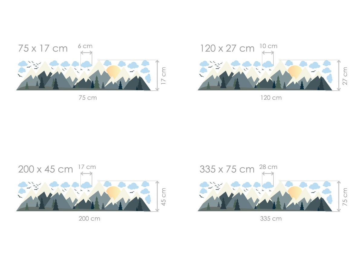 Samolepka na stenu „Hory a mráčky“ priáší do detskej izby pokojnú a harmonickú atmosféru inšpirovanú prírodou. Štylizované horské vrcholky v jemných, prírodních tónech dopĺňají ľahké mráčky, poletující ptáčci a zapadající slnko, ktoré spoločne vytárejí vyváženú a upokojující scenériu. Motív pôsobí moderne, čisto a nadčasovo, takže sa skvele hodí ako do izbíčky malých detí, tak aj do interiérov pre vetší chlapcov či dievčatá. Díky panoramatickému po&iacate; krásne vyplní spodní část steny a dodá priestoru hĺbku, pocit otvorenosti a prirodzeného rytmu. Samolepka je ideální voľbou pre rodičov, ktoríí chcejí vytvoriť príjemné, pokojné prostredí podporující fantáziu, pohodu a každodenní objavování sveta.