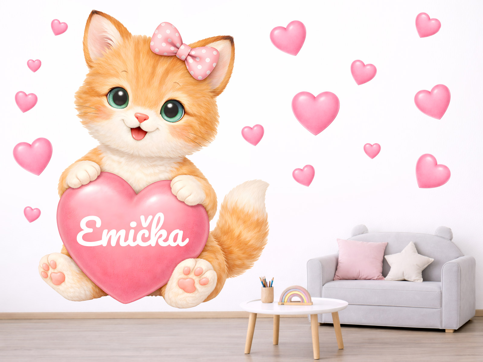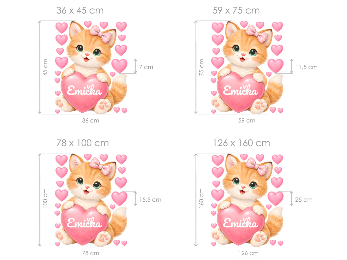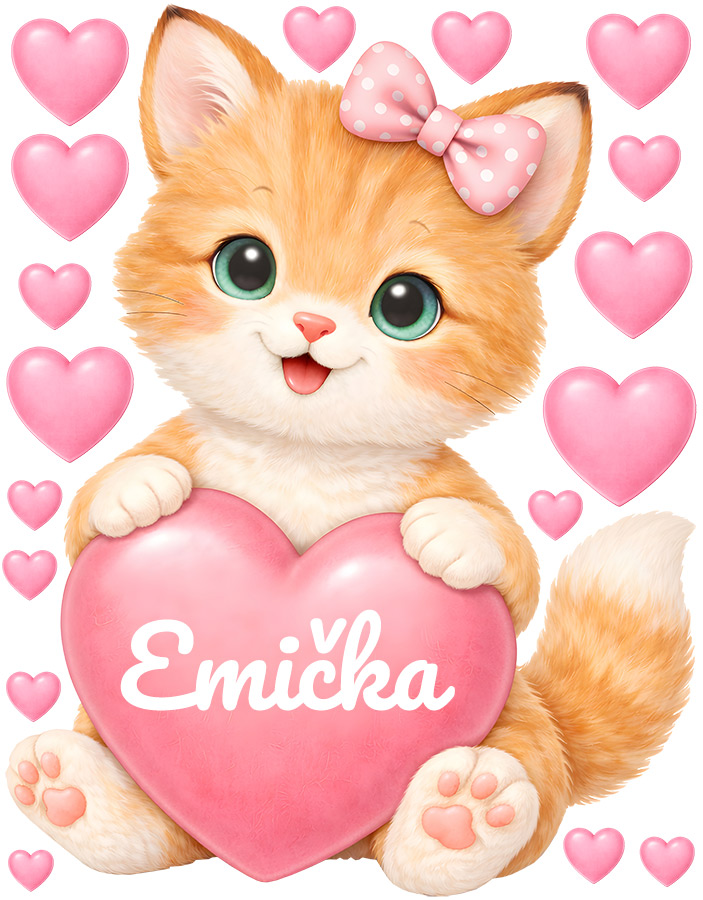 Meno na prání v srdíčku je mo|né samotné alebo kombinovať s dátumom narodenia. alebo napríklad vekom (tento údaj bude vycentrován pod jménom v druhém riadku). Text zadajte v 3. kroku objednávky do pola "poznámka". Ak máte speciální prání kontaktujte nás: info@nalepte.sk. Bude Vám zaslaán náhlad na schálení emailom. Samolepka na stenu Rezavé mačiatko so srdcom a menom vnesie do detskej izby radosť, nehu a jedinečnú atmosféru; osobní kúzlo. Roztomilé hrdzavé mačiatko s mašličkou a veľkýma zárivýma očami objímající ružové srdíčko pôsobí hravo, milo a láskyplne, zatímco drobná srdíčka okolo vytvorírejí veselú a hrejivú atmosféru. Motív je navrhnutý tak, aby sa stal osobním prvkom detského sveta – jméno na srdíčku dodává dekoráciu jedinečný charakter a vytáriaí silneé citové puto. Jemné pastelové farby, hebký vzhľad srsti a priátelský výraz mačiatka krásne zapadnú do izbyíčku pre bábätká aj vetší deti a hodí sa najmä do jemne ružovích, neutrálních i pohádkovo lade&´ch interiérov. Zákazník obdrí hárok s hlavním motívom mačiatko doplnený o samostatná srdíčka, diaíky ktor&msa mo|no vytvori† hravú a harmonickú kompozíciu poda vlastneí predstavy. Celý dizajn pôsobí nežne, veselo a nadčasovo a stane sa krásným osobním doplnkom detskej izby.