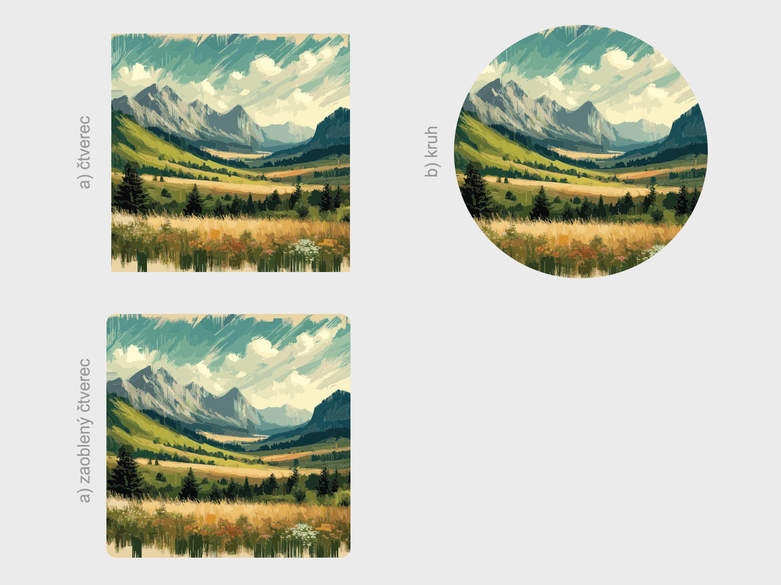 Tvar je možné zmeniť. Možno vybrať a) štvorec, b) kruh, c) zaoblený štvorec viď fotogaléria. Ak teda máte zájem o iný tvar ako na hlavní fotografiu, stačí v posledním kroku objednávky do pola poznámka napísa napr. "kruh". Jedná sa o tištený samolepící plakát - imitácia maľby Je možné zvoliť aj ľubovoľneý vlastní rozmer hárku pomocí posuvníku alebo klikání na "Vetší", "Menší"
