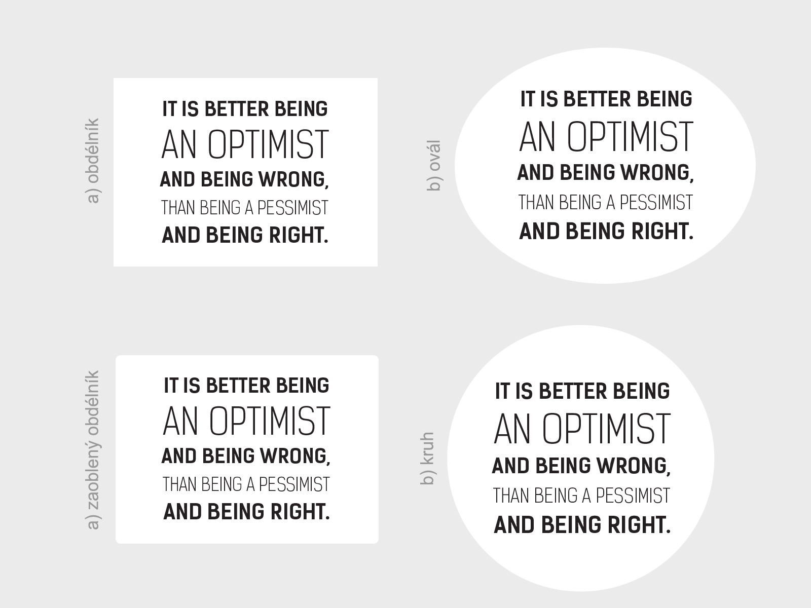 Ak vám nevyhovují preddefinované rozmery, je možné zvoli vlastní rozmer pomocí posuvníku, môžete si také vybrať z cca 50 farieb. Jedná sa o tlač na bielu samolepící vinylovú fóliu s tvarovým orezom. Lepení je jednoduché a bez priehľadné prenosové fólia. Ide o kombináciu bílého pozadí + Vámi vybrané farby. Tvar bílého pozadí je možné zmeniť. Možno vybrať a) obílník, b) ovál, c) zaoblený obdélník, d) kruh viď fotogaléria. Ak teda máte zájem o iný tvar ako na hlavní fotografiu, stačí v posledním kroku objednávky do pola poznámka napísa napr. "kruh". Dostanete email s potvrdením a finálním náhľadom. Není možné zvoli† farbu textu: bielu 010 alebo jednu z metalickích farieb: 090 striíbrná, 091 zlatá; Ak zvolíte jednu z týchto farieb budete kontaktováni ohľadne zmeny farby alebo zrušení objednávky. Kto je tu optimista? Tak hurá vylepovať túto samolepku na stenu. Nápis s prekladom, že je skrátka lepší být optimistom a mílit sa, ako by pesimistom a mít pravdu pote&scaroní každého. Svoje; místo pre nalepení nájde v obývacím izbe, spálni alebo pracovni. Zútuľnite si svoj byt a majte svet veselejší.
