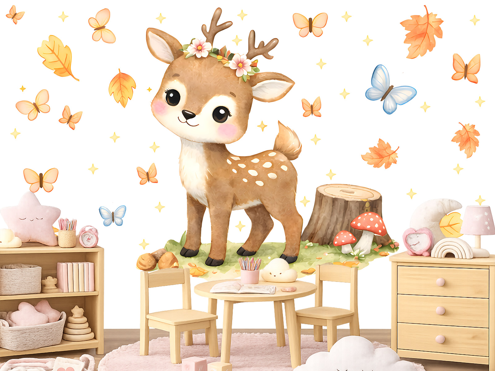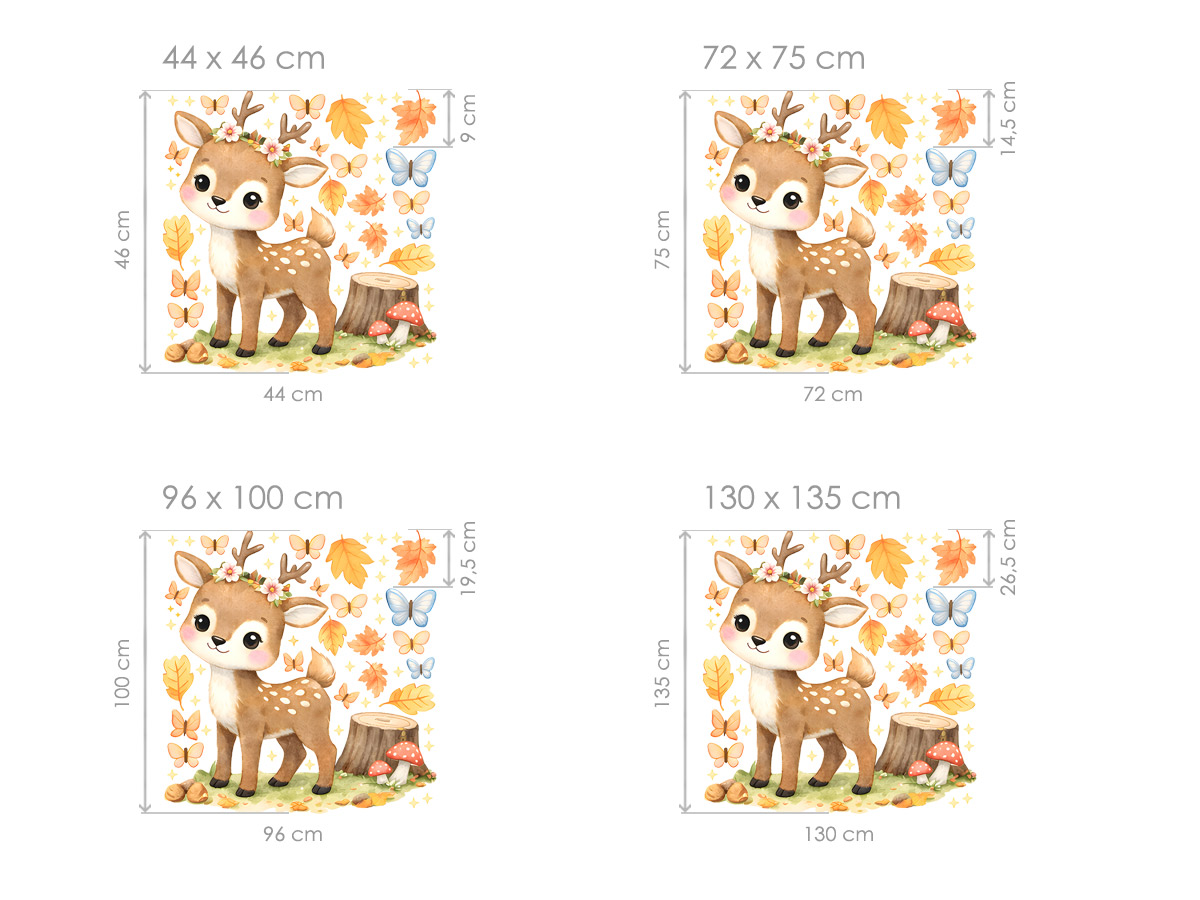 Táto jemná nálepka s roztomilým jeleníkom prinesie do detskej izby pokojnú atmosféru lesa. Jemné pastelové farby, jesenné lístie a motýle vytvárajú rozprávkovú scenériu, ktorá pôsobí teplo a útulne. Nálepka vyzerá krásne nad detskou postieľkou, posteľou alebo v detskom kútiku a je ideálnou voľbou pre malých milovníkov prírody a lesných zvierat.