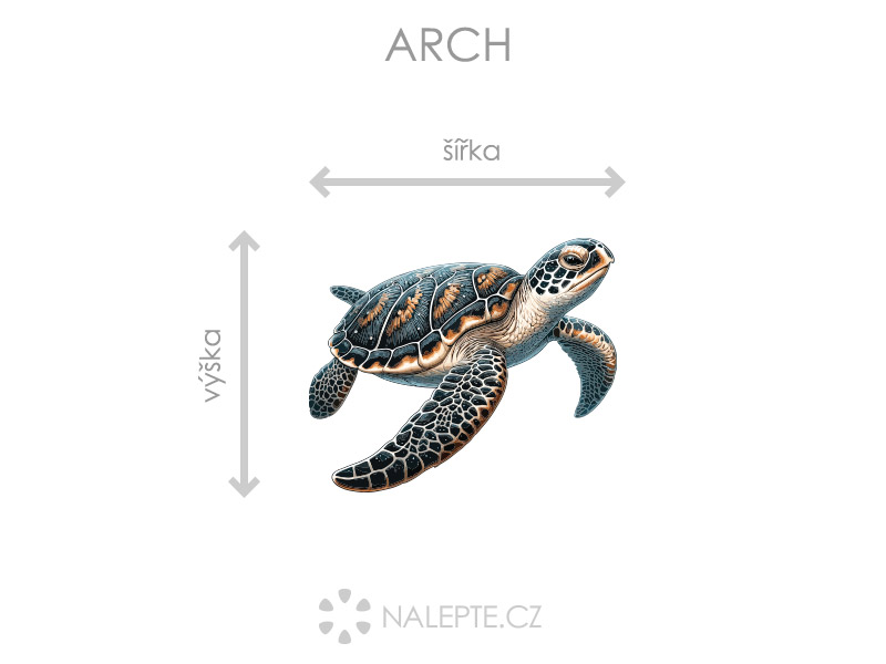 Arch = Arch si môžete prehliadnuť vo fotogalérii. Rozmer archu volíte v objednáke. Prehľad preddefinovaních rozmerov (šírka x výška): a) hárok 11 x 20 cm b) hárok 27 x 47 cm c) hárok 43 x 75 cm d) hárok 57 x 100 cm e) hárok 75 x 130 cm Je možné zvoliť aj ľubovoľneý vlastní rozmer hárku pomocí posuvníku alebo klikání na "Vetší", "Menší" Korytnačka Kareta terazí môže zdobiť aj vašu stenu. Túto samolepku pre vás vyrobíme v lubovolných veľkostiach. Odporúčame doplniť ďalšími nálepkami morských živočíchov z naší ponuky ídky.