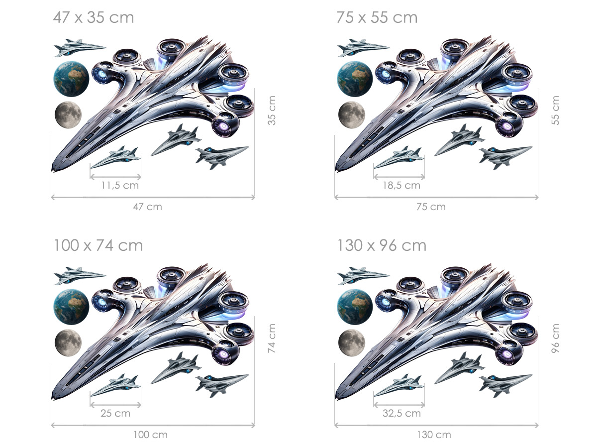 Samolepka na stenu „Kosmická loď“ priáší do detského izby dechberoucí výjav z ďalekého vesmíru – majestátní futuristickú loď plnú detailov a svetelných efektov, doplnenú elegantními síhačkami a realisticky spracovanú Zemí i Mesícom. Celý motív vytváraí atmosféru veľkolepé medzihviezdneé výpravy, ktorá deti okamžite vtiahnu do fantastického dobrodružstva. plného rýchlosti, tajomstvoí a neprebádaných galaxií. Každý prvok je navrhnutý s vysokou precíznosí tak, aby dohromady tvorili harmonickú a dynamickú scénu, ktorú je mo|né lubovolne rozmísti† na stenu. Tento vesmírný set podnecuje fantáziu, rozvíjí kreativitu a premení izba v místo, kde zaè&íná každý malý astronaut svoj vlastní velký príbeh.