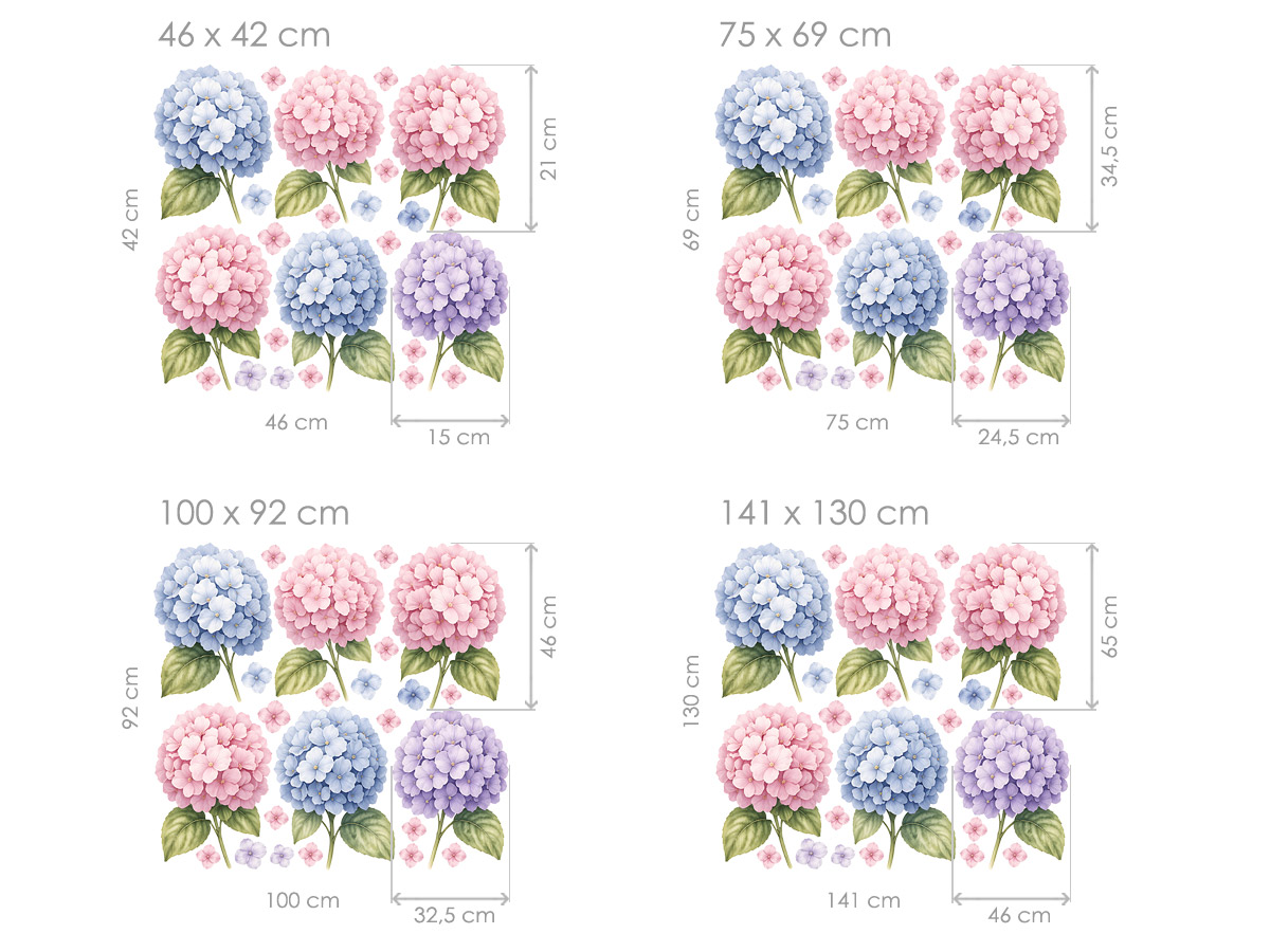 Nálepka na stenu „Kvety hortenzie“ vnáša do interiéru jemnosť, eleganciu a romantickú atmosféru. Kombinácia pastelových odtieňov ružovej, modrej a fialovej vytvára harmonický celok, ktorý pôsobí pokojne a zároveň dekoratívne. Detailné akvarelové spracovanie zdôrazňuje bohatú štruktúru kvetov hortenzie a prirodzené farebné prechody. Menšie kvietky roztrúsené okolo hlavných motívov dodávajú kompozícii ľahkosť a vzdušnosť. Nálepka je ideálna do obývacej izby, spálne aj jedálne, kde vytvorí príjemné a útulné prostredie. Vďaka svojmu univerzálnemu dizajnu sa ľahko kombinuje s moderným aj prírodným štýlom bývania. Skvelá voľba pre všetkých, ktorí chcú do svojho domova vniesť jemnosť, sviežosť a nadčasovú kvetinovú eleganciu.