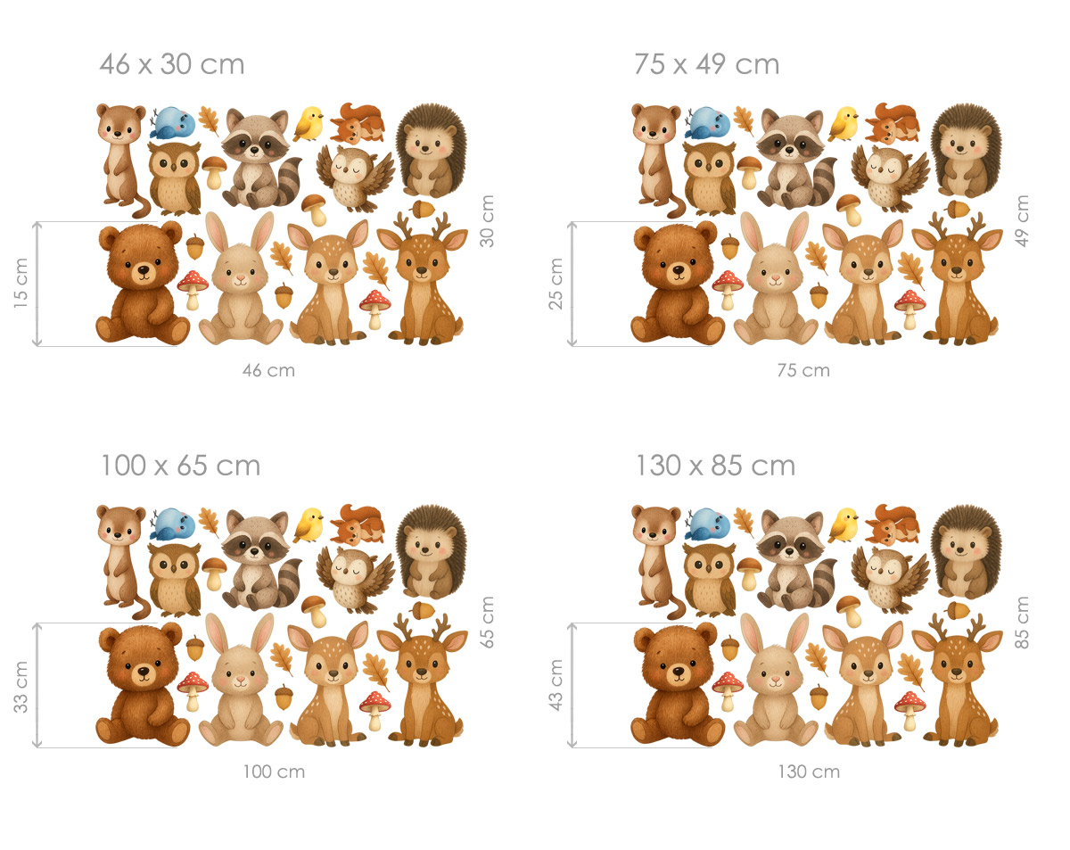 Samolepky sú ilustrovány v jemnomém, teplém štýle s pastelovými farbami a mäkk&´mi prechodmi, diíky, čomu pôsobí prirodzene a útulne. Môžete ich rozmísti† poda vlastneí fantázie – na stenu, nábytok, dvere či detskú postýlku – a vytvoriť si tak originální lesní scénu.