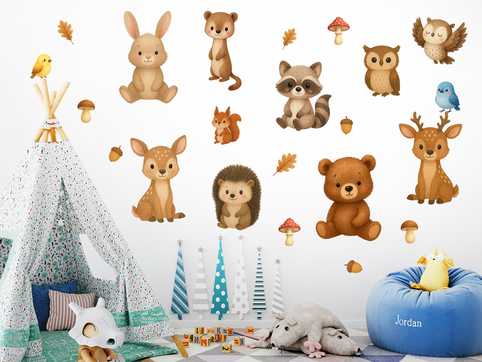 Vneste do detskej izby teplo, kľud a hravosť s pôvabnou sadou Lesní zvíria kamarádi. Roztomilý medvídek, zajaíček, srnky, mýval, ježko, malej sovy a další lesní prátelé vytvorí z vášeho domova kúzelneé místo plné pohody a fantázie.