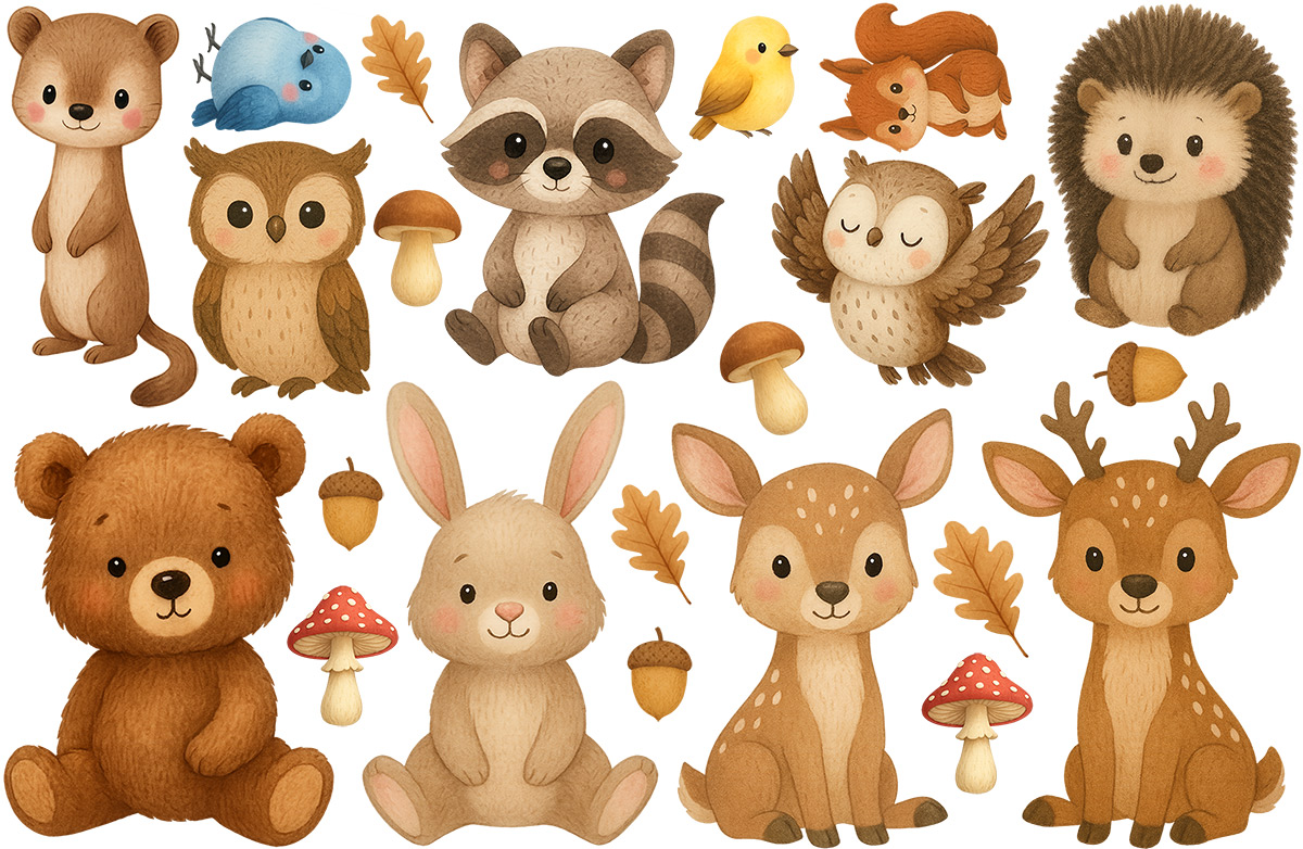- Lesní zvírátka: medvídek, zajaíček, srnky, mýval, malej sovy, lasička, ježko, veverička, vtácky