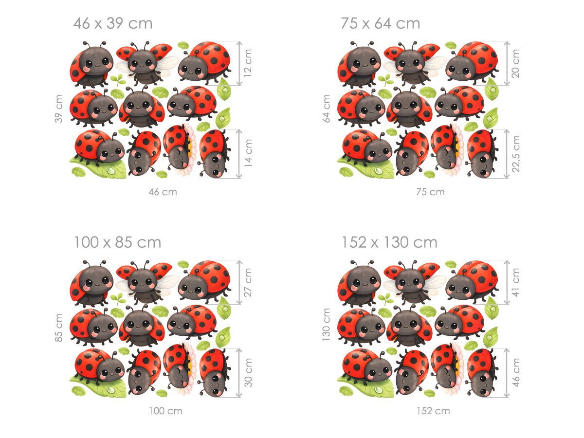 Jednotlivé nálepky na stenu môžete usporiadať podľa vlastnej fantázie – vytvorte veselú kompozíciu nad detskou postieľkou, hravý motív okolo postele alebo jemne rozptýlenú dekoráciu po celej stene. Ladybugs vytvoria útulné prostredie plné radosti, kde sa deti budú každý deň cítiť pohodlne.