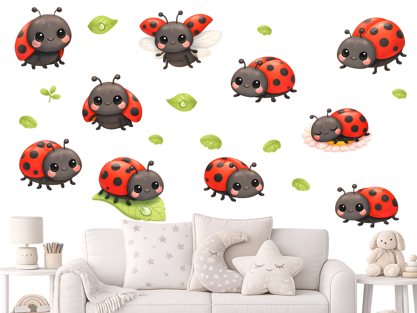 Motív pôsobí ľahko a prirodzene, ako keby malé lienky práve kráčali po listoch alebo sa chystali odletieť do záhrady plnej kvetov. Vďaka hravému dizajnu a výrazným červeným farbám je dekorácia krásne viditeľná a deti si ju rýchlo zamilujú.