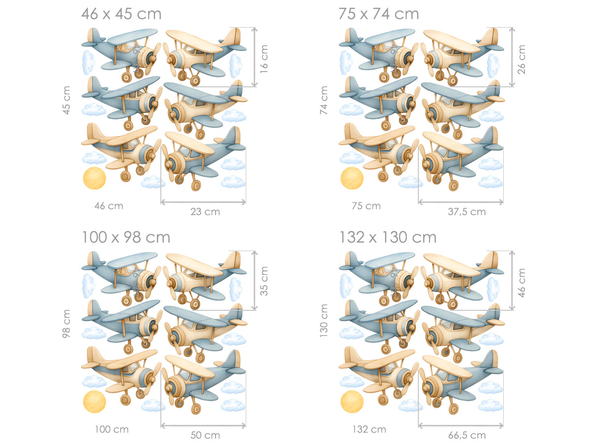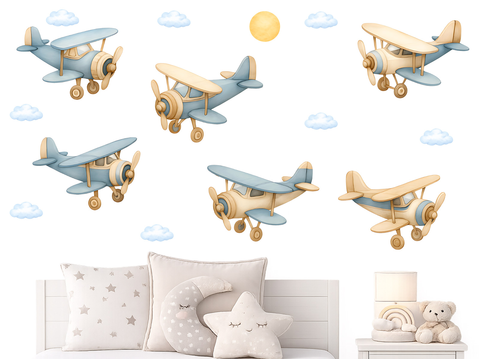 Nálepky na stenu Lietadlá dvojplošníky prenesú detskú izbu do sveta dobrodružného lietania vysoko nad oblakmi. Roztomilé retro dvojplošníky v jemných pastelových farbách dopĺňajú ľahké oblaky a slnko, čím vytvárajú hravú a vzdušnú scénu plnú pohybu a fantázie. Celý motív pôsobí radostne a prirodzene, ako keby lietadlá práve vyrazili na malú expedíciu po oblohe. Jemné akvarelové tóny a jemné tieňovanie dodávajú ilustráciám pokojný a harmonický vzhľad, vďaka čomu sa motív krásne hodí do svetlej detskej izby. Pastelové modré a béžové odtiene vytvárajú príjemnú atmosféru, ktorá podporuje relaxáciu aj detskú fantáziu. Pri pohľade na lietadlá si deti môžu vymýšľať vlastné príbehy o pilotoch, objavovaní nových krajín a dobrodružných letoch medzi oblakmi. Jednotlivé nálepky je možné usporiadať podľa dostupného priestoru a vytvoriť si vlastnú oblohu plnú lietadiel – napríklad nad posteľou, okolo detskej postieľky alebo na väčšej prázdnej stene v izbe. Vďaka rôznym veľkostiam listov si môžete ľahko vybrať možnosť, ktorá najlepšie vyhovuje vášmu interiéru, a premeniť detskú izbu na malé letisko plné snov a dobrodružstiev.