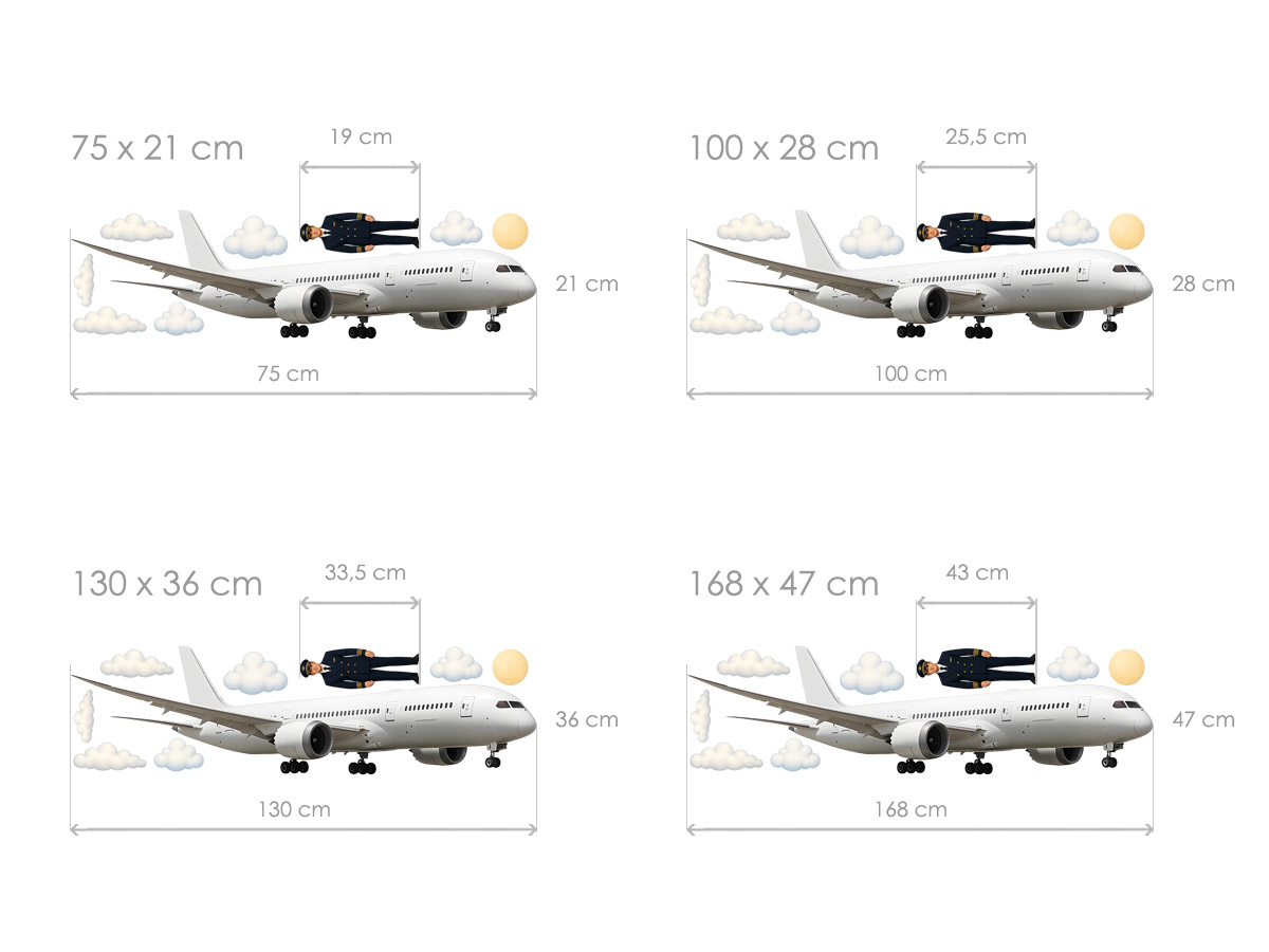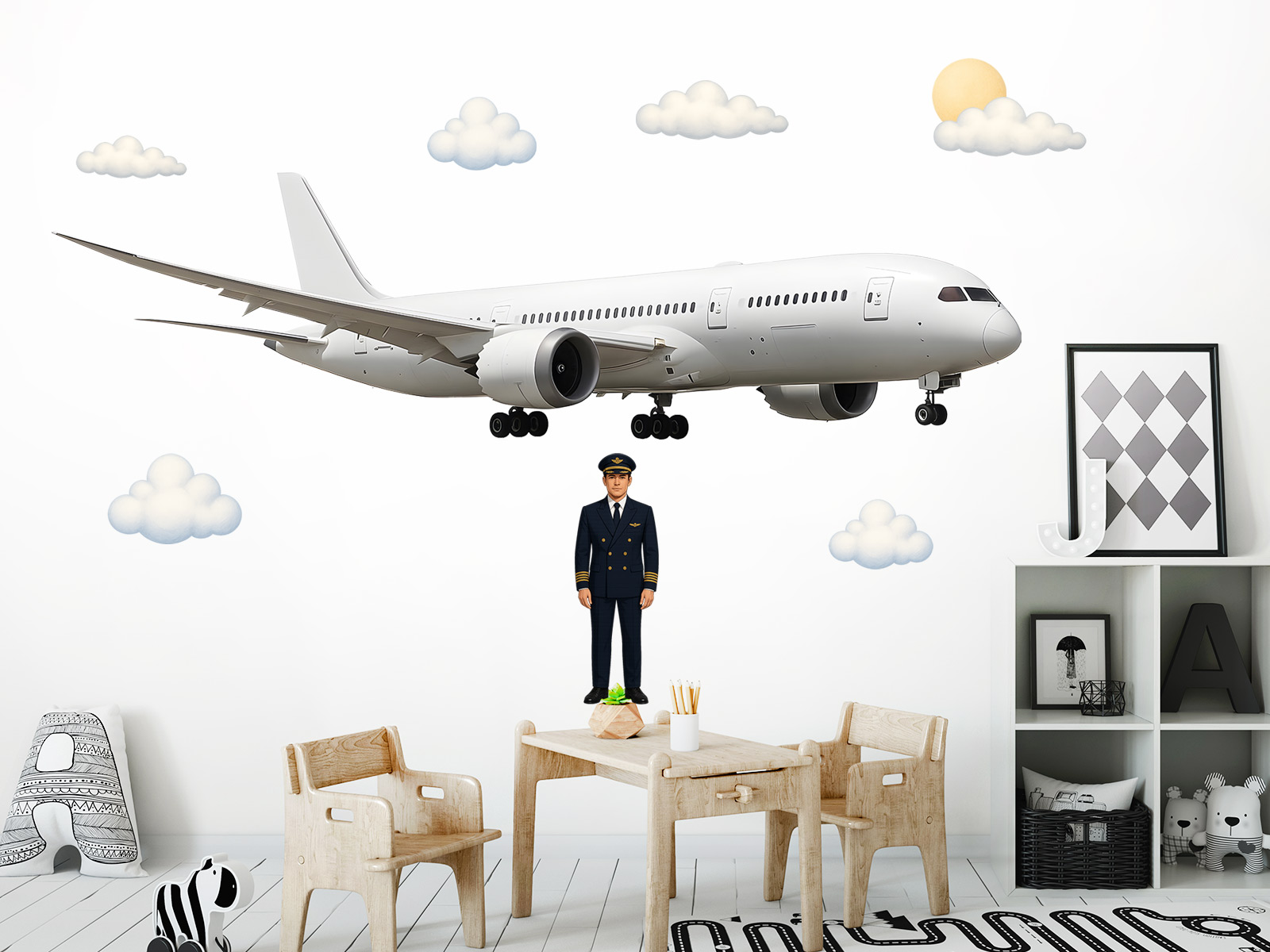 Samolepka na stenu „Lietadlo Boeing“ priáší do detskéej izby atmosféru skutočného dobrodružstva. a vzdušného sveta. Dominantou je realisticky spracovaná; velké dopravní lietadlo Boeing doplnenýé milým pilotom, jemnými obláčkami a slnkom, ktoré spoločne vytárejí hravý a pritom harmonický celok. Díky modernímu, čistému dizajnu pôsobí motív ľahko a elegantne, takže sa perfektne hodí nie len do izieb malích milovníkov lietadiel, ale aj do herních kútikov alebo tematických miestností. Priestor okamžite ožije predstavivosťí – deti sa môžu stát pilotmi vlastního obrího lietadla a každý deň sa vydáva na nové imaginární cesty okolo sveta. Samolepka pôsobí efektne aj v menších interiérách a jednoducho sa kombinuje s dalšími dekoráciami v podobnom štýle.