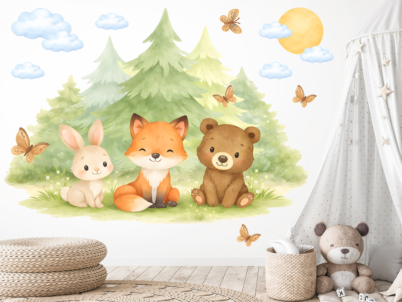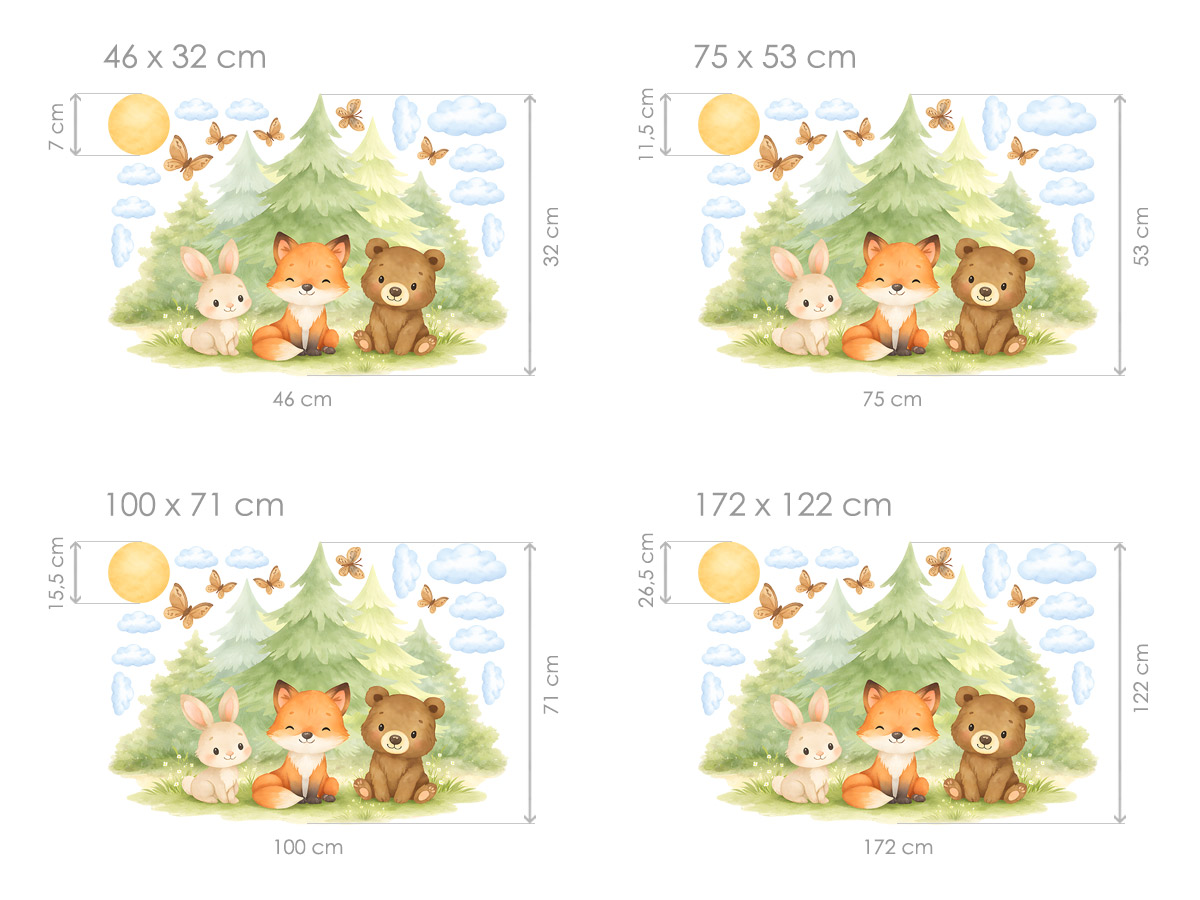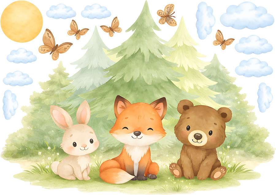 Samolepka na stenu Liška, zajaíček a méďa prenesie detský izba do kúzelného lesního sveta plného pokoja, pohody a priátelstva; Roztomilá trojica lesních kamarádov sedící pred jemnými zelenými stromami pôsobí milo, harmonicky a upokojujícím dojmom, ktorý je ideální pre vytvorí útulné atmosféry. Akvarelový štýl ilustrácie s mäkkími pastelovými farbami, obláčkami, motílkami a slníkom podporuje detskú fantáziu a navodzuje pocit bezpečí a radostného sní. Motív sa krásne hodí do izbíčku pre bábätká aj vetší deti a ľahko zapadne do prírodne, škandinávsky aj neutrálne lade&´ch interiérov. Zákazník obdrí hárok s hlavním motívom lišky, zajaíčka a méď doplnený o samostatné dekoratívneí prvky, diíky ktor&msa vytvori' vyváženú a harmonickú kompozíciu podπa vlastnejí predstavy. Celý dizajn pôsobí nežne, nadčasovo a hrejivo a stane sa krásnou dominantou detskej izby.