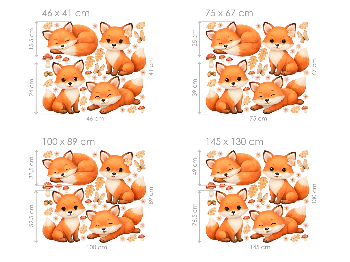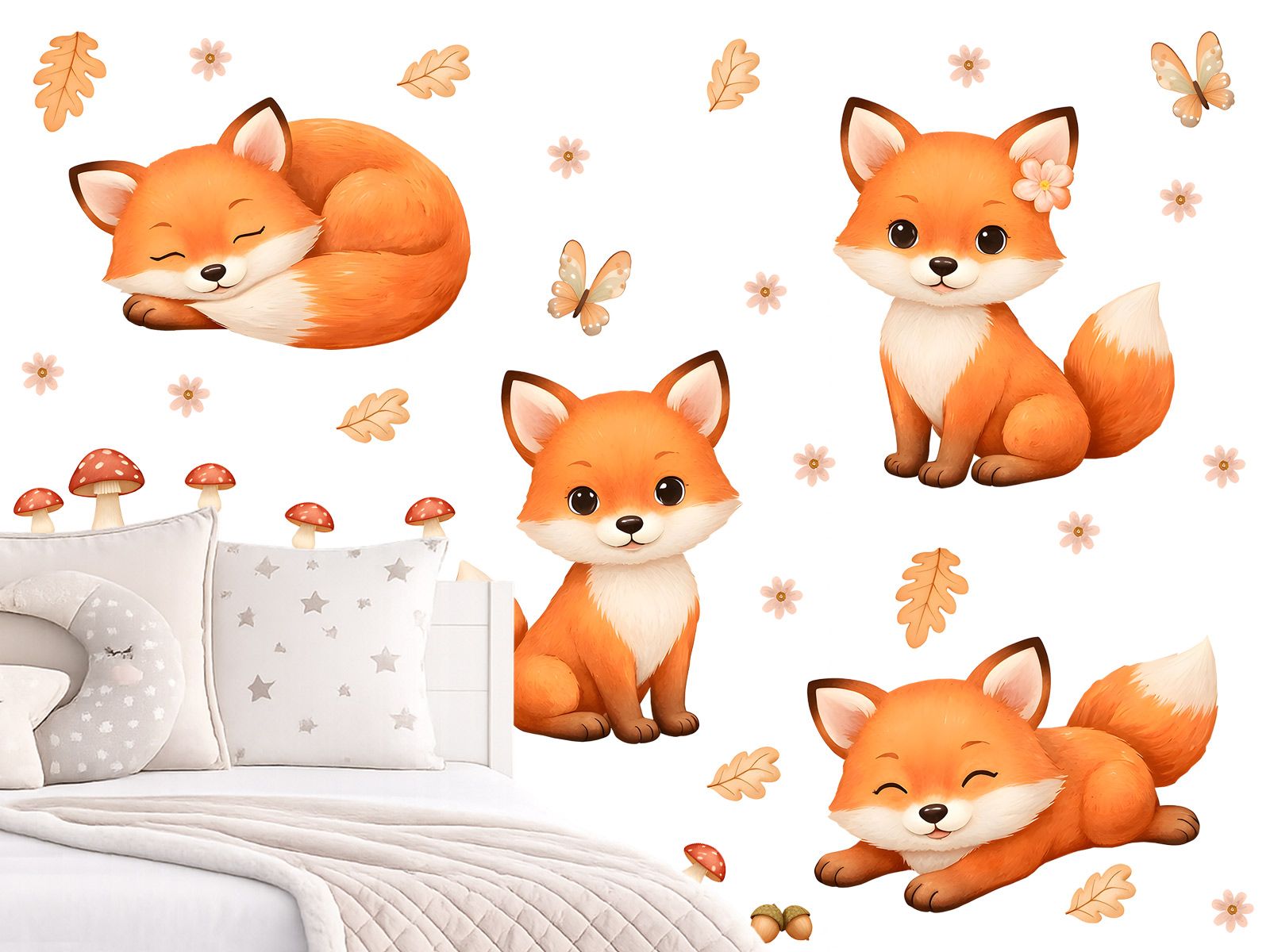 Nálepky na stenu „Líšky z lesa“ sú hravou a jemnou dekoráciou, ktorá do detskej izby vnesie teplo a pohodu prírody. Roztomilé líšky v rôznych polohách – spiace, sediace aj hravé – pôsobia veľmi priateľsky a prirodzene. Celý motív dopĺňajú jemné detaily ako lístky, huby, kvietky a motýle, ktoré vytvárajú ľahkú lesnú atmosféru. Teplé oranžové odtiene líšok krásne kontrastujú s jemným pozadím a dodávajú priestoru útulnosť. Vďaka samostatným prvkom si môžete jednotlivé líšky rozmiestniť podľa vlastného priestoru a vytvoriť tak originálnu kompozíciu na mieru. Ideálne nad posteľ, do kútika na hranie alebo na väčšiu stenu, kde vynikne celý lesný príbeh.