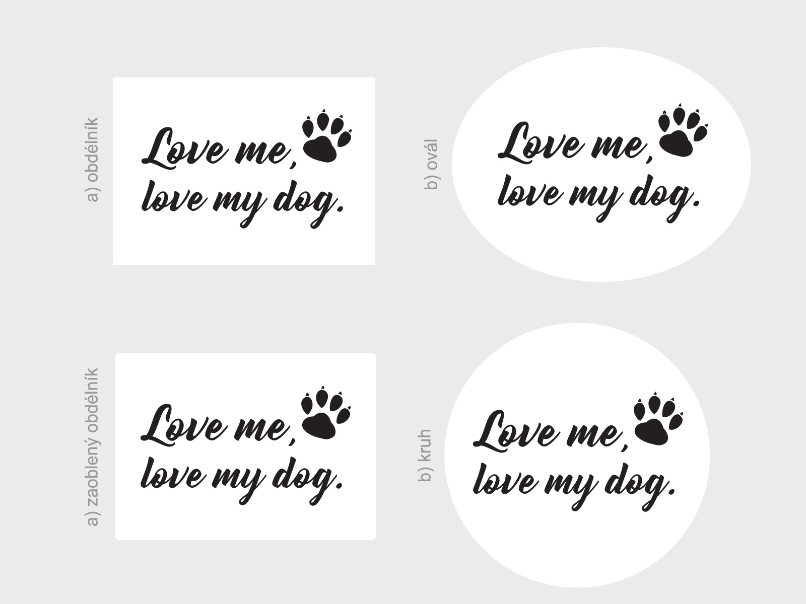 Ak vám nevyhovují preddefinované rozmery, je možné zvoli vlastní rozmer pomocí posuvníku, môžete si také vybrať z cca 50 farieb. Jedná sa o tlač na bielu samolepící vinylovú fóliu s tvarovým orezom. Lepení je jednoduché a bez priehľadné prenosové fólia. Ide o kombináciu bílého pozadí + Vámi vybrané farby. Tvar bílého pozadí je možné zmeniť. Možno vybrať a) obílník, b) ovál, c) zaoblený obdélník, d) kruh viď fotogaléria. Ak teda máte zájem o iný tvar ako na hlavní fotografiu, stačí v posledním kroku objednávky do pola poznámka napísa napr. "kruh". Dostanete email s potvrdením a finálním náhľadom. Není možné zvoli† farbu textu: bielu 010 alebo jednu z metalickích farieb: 090 striíbrná, 091 zlatá; Ak zvolíte jednu z týchto farieb budete kontaktováni ohľadne zmeny farby alebo zrušení objednávky. Jednoduchá textová samolepka na stenu pre všetkých milovníkov psov. ponuky, stačí si len vybrať.