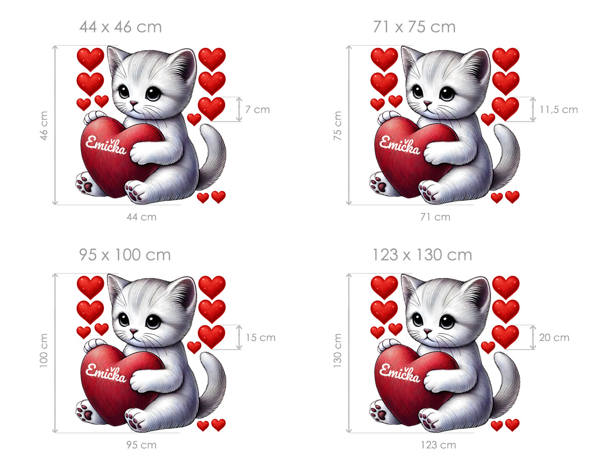 Meno na prání v srdíčku je mo|né samotné alebo kombinovať s dátumom narodenia. alebo napríklad vekom (tento údaj bude vycentrován pod jménom v druhém riadku). Text zadajte v 3. kroku objednávky do pola "poznámka". Ak máte speciální prání kontaktujte nás: info@nalepte.sk. Bude Vám zaslaán náhlad na schálení emailom. Samolepka na stenu „Koťátko so srdíčkom a jménom na prání“ je dokonalou dekorací do detského pokojíčku, ktorá vnesie nehu, farby a osobní kúzlo. Roztomilé bílé mačiatko s obrovskými očkami jemne objímá srdíčko, na ktoré vám vytvoríme meéno podπa prání – díky tomu sa z dekorácie stává jedinečnýý a originální doplnok. Súčástí sú aj samostatná červená srdíčka, ktorá môžete rozmístit podπa libosti a vytvori tak krásnu scénu nad postýlkou alebo u hracího kútika.