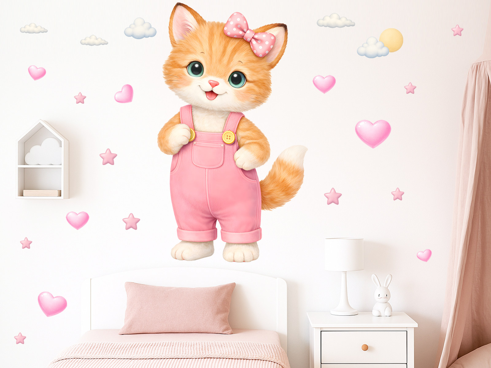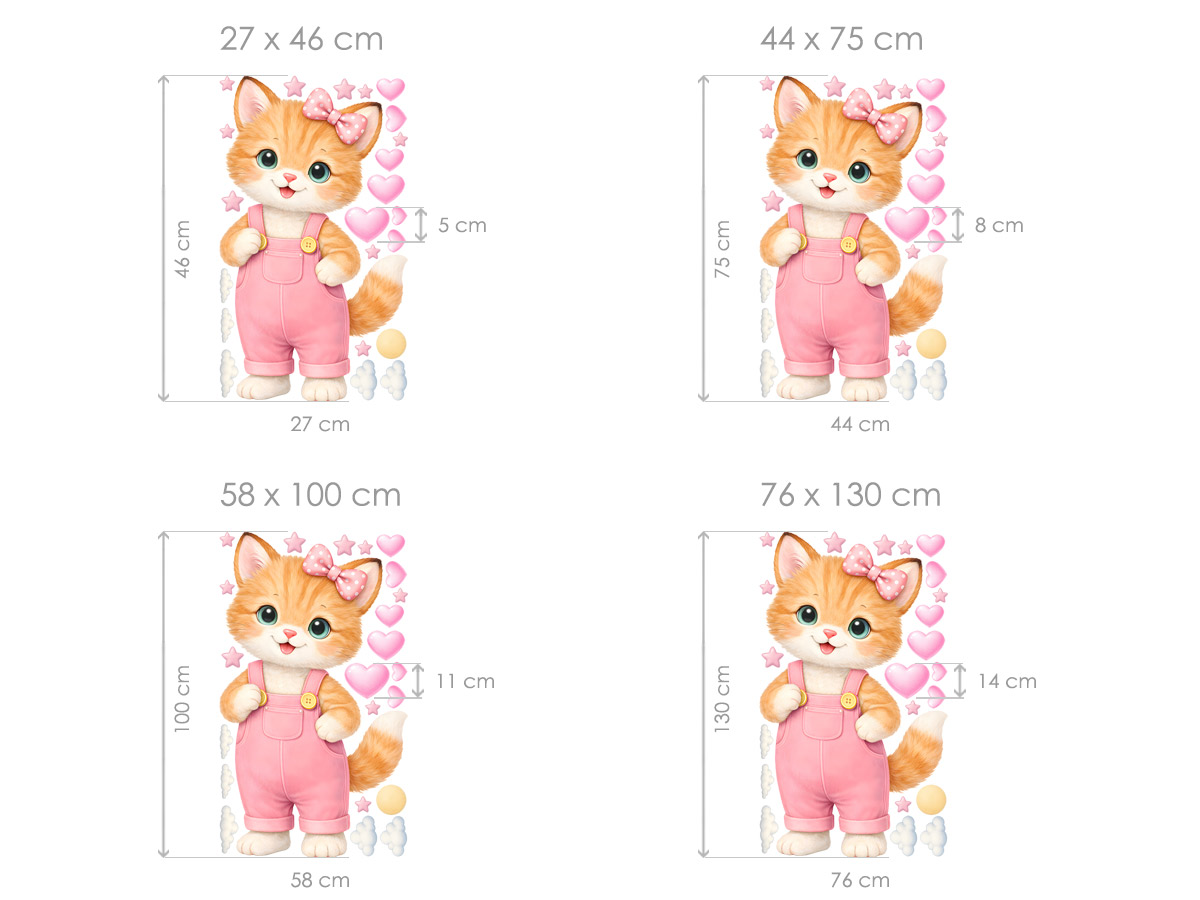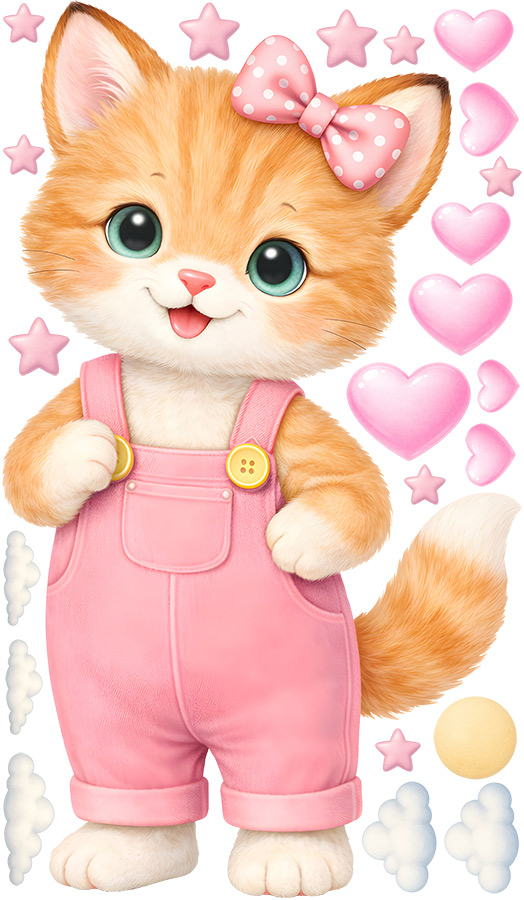 Samolepka na stenu „Koťátko v nohaviciach“ vnesie do detskej izby nežnú, hravú atmosféru plnú radosti a fantázie. Roztomilé mačiatko s veľkíma zárivýma očami, ružovou mašličkou a nohavičkami pôsobí milo, priátelsky a okamžite si získá pozornosť malých aj vetších detí. Motív je doplnený jemnými dekorativními prvkami v podobe srdíčiek, hviezdičiek, oblákov a slníčka, ktoré vytárejí ľahký, pohádkový dojem a podporují pocit bezpečí a pokoja. Harmonická pastelová farebnosť sa ľahko sladí s interiérom detského izby a dodá priestoru teplo, útulnos a pozitívneí náladu. Súčástí produktu je arch so samolepkou a náhladová vizualizácia, ktorá ukazuje, ako jemne a prirodzene motív pôsobí na stene v reálnom prostredí.