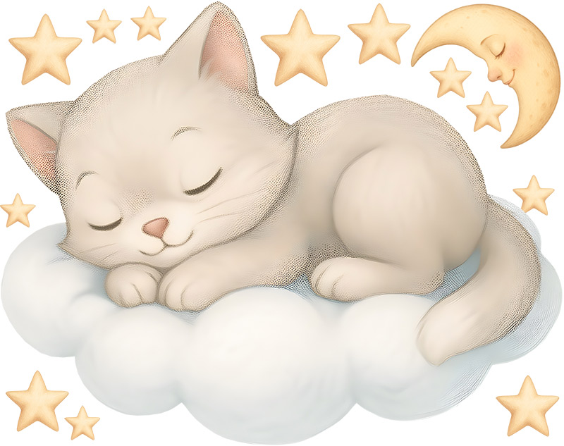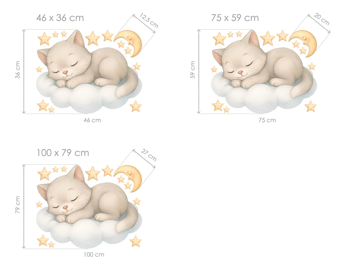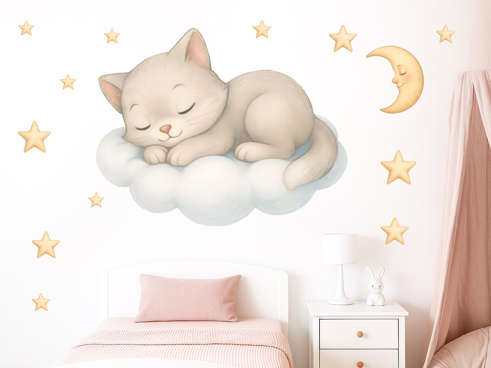 Samolepka na stenu „Mačka na obláčku“ vnesie do detského pokojíčku nehu, pokoj a pohádkovú atmosféru. Roztomilá spící mačička stočený; na nadýchaném bílém obláčku pôsobí jemne, priátelsky a dokonale zapadne do interiérov ladených v pastelových odstínoch. Decentní hviezdičky a mesíček cielý motív krásne dopĺňají a vytárejí harmonickú kompozíciu, ktorá upokojuje a podporuje príjemneé usínání. Na archu, ktorý zákazník obdrí, je kompletní sada prvkov pripravených na jednoduché aplikáciu – jednotlivé části je mo|né rozmísti† poda vlastnejího vkusu, takže výposledné dekorácie môžu být vždy originální.