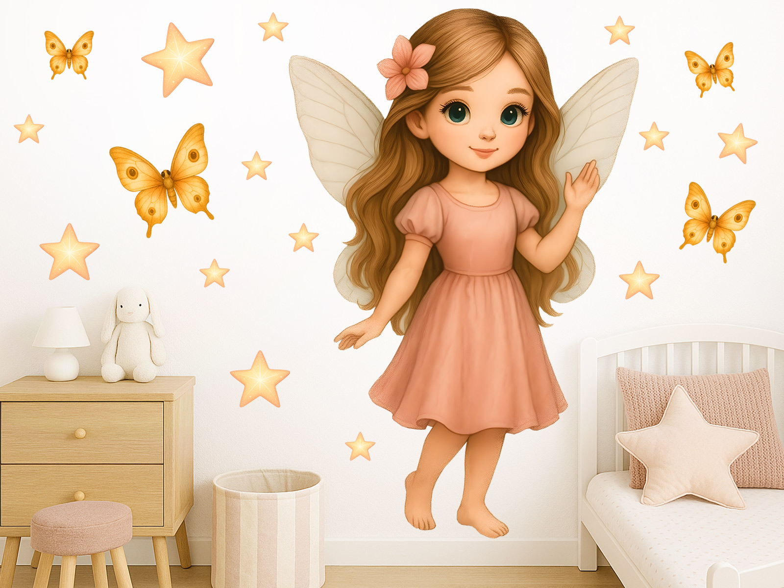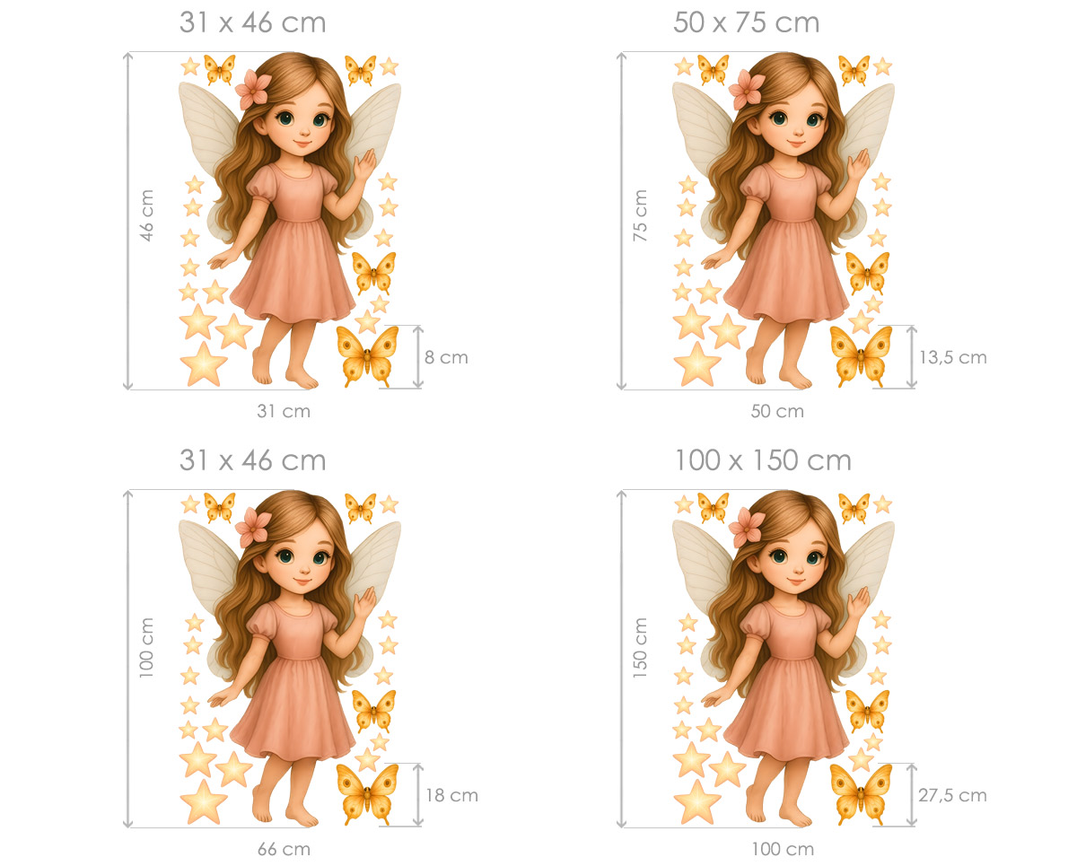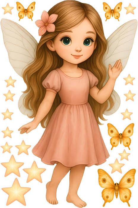 Samolepka na stenu „Malá víla“ premení každý detský izbaíček v nežný kúzelný svet plný ľahkosti a fantázie. Jemná víla v broskyňových odstínoch, obklopená zárivými hviezdičkami a motýlky, vytvára&´ harmonickú a radostnú atmosféru, ktorá poteší každú malú princeznú. Díky starostlivému spracování a kvalitníej tlači pôsobí ilustrácie ako živá – krázná tvárička, dlhé vlásky aj krídlá dodají priestoru pohádkové kúzlo. Samolepky sú rozmerovo navrhnuté tak, aby pôsobili dominantne, ale zároveň ladne doplnili celú stenu. Na archu také nájdete drobné prvky ako motýlky a hviezdičky, ktoré si môžte rozmístit presne podπa svých predstáv.