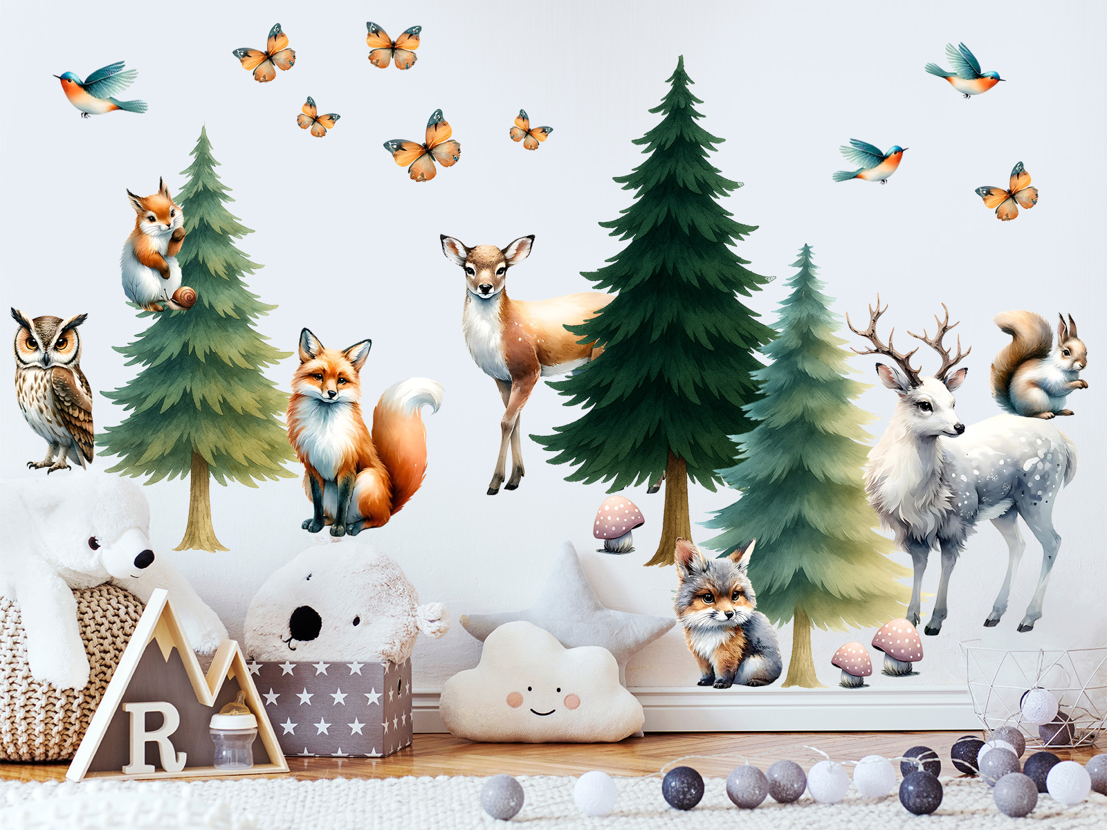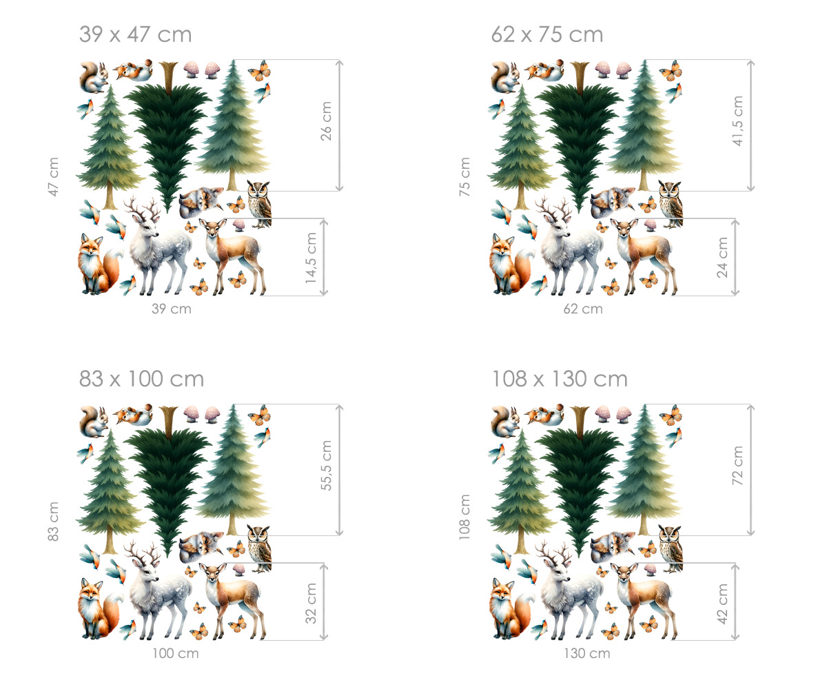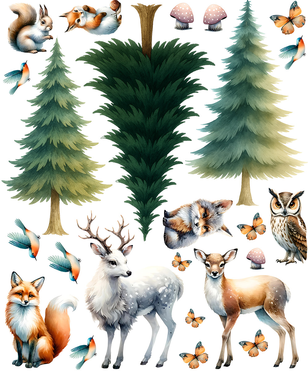 Objavte kúzlo lesa priímo v detskej izbe s nádhernou sadou samolepiek „Malovaná lesní zvírátka“.Jemne akvarelové ilustrácie prinášají do interiéru pokojnú atmosféru prírody a vytvárají útulné a hrejivé prostredí pre malé objaviteπa aj snílky. V sade nájdete lišky, jeleňa, srnku, sovu, veveričky, vtáčky, motýle a muchotrávky, doplnený; o malované ihličnaté stromy. Každý motív je samostatná samolepka, takže si môžete vytvoriť vlastní lesní scénu pod a fantázie – okolo postýlky, stolíka alebo v hracím kútiku.