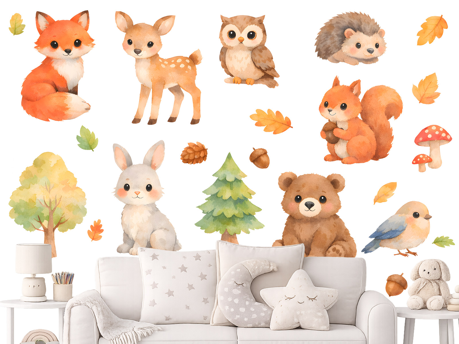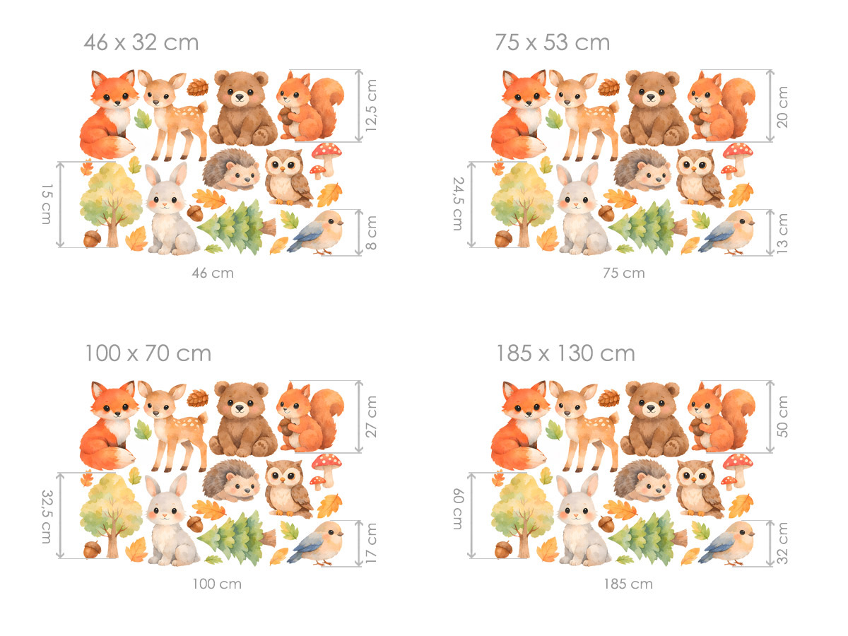 Malovaná zvíria z lesa prinesú do detskej izby pokojnú atmosféru prírody a kúzlo pohádkového lesa. Jemné akvarelové ilustrácie lšky, srnky, medvediacka, zajaíčka, malej sovy a dalších lesních zvírátok sú doplné o stromy, listy, šišky a drobné lesní detaily, ktoré spoločne vytárejí harmonický a hrejivý celok. Mäkké farby, roztomilé výrazy a ručne malovaný vzhľad podporujeí fantáziu a navodzujúí pocit bezpečí a pohody, ideální pre najmenší deti a predkolky; Samolepky je mo|né rozmísti† poda vlastneí predstavy – vytvoriť lesní scenériu nad postýlkou, čítací kútik plný zvígrích kamarádov alebo jemnú dekoráciu, ktorá porastie spolu s dítetom a zostane nadčasová aj v dalších rokoch.