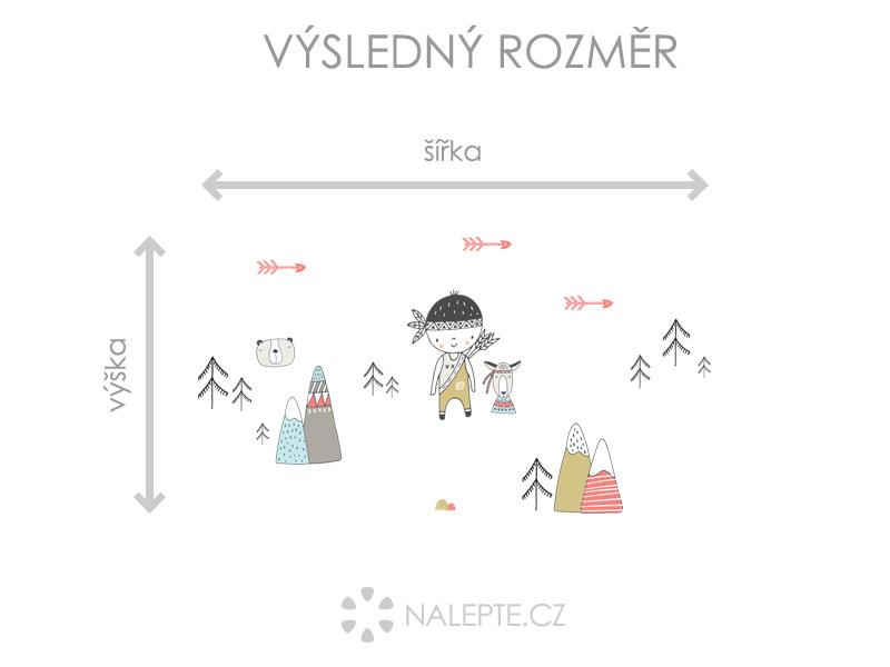 Výposledný rozmer = rozmer po nalepení na stenu podľa hlavní produktové fotografie (samozrejme môžete rozlepiť prvky úplne ľubovoľne a získáte úplne iné výposledné rozmery). Arch = takto vám bude samolepka doručená. Z hárku jednotlivé části odlepíte a nalepíte na stenu tak, aby zložili výposledný motív podľa Vašich predstáv. Arch si môžte prehliada'a vo fotogalérii. Rozmer archu volíte v objednáke. Prehľad rozmerov (šírka x výška): - výposledný rozmer 89 x 49 cm = hárok 47 x 27 cm - výposledný rozmer 143 x 77 cm = hárok 75 x 43 cm - výposledný rozmer 190 x 104 cm = hárok 100 x 58 cm - výposledný rozmer 427 x 234 cm = hárok 225 x 130 cm Výška malého indiána odpovedídá zhruba jedé polovici šíra hárku. Samolepky na stenu s motívom malého indiána sú dokonalým doplnkom pre každý izbuíčiek malých dobrodruhov. Táto samolepka je inšpirovaná indiánským tématom, ktoré priáší do izbyíčku vzrušující atmosféru dobrodružstva. Je veselá a farebná, ço dodává priestoru živosť a oživí akúkoľvek stenu. Táto samolepka je ideální pre chlapcov, ktoríí milují príbehy o statočneých indiánech.