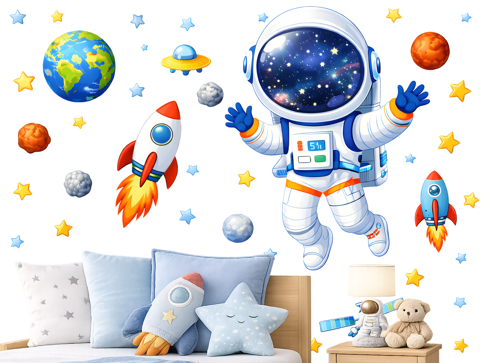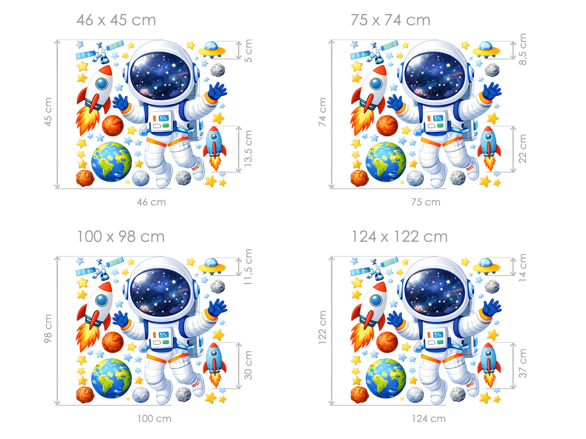 Nálepka na stenu „Malý astronaut“ pozýva deti na dobrodružnú cestu do vesmíru plného hviezd, planét a rakiet. Hlavným motívom je roztomilý astronaut vznášajúci sa vo voľnom priestore, doplnený farebnými ilustráciami Zeme, planét, rakiet, satelitov a hviezd, ktoré spolu vytvárajú hravú a fantazijnú scénu. Vďaka samostatným prvkom si deti môžu motívy usporiadať podľa vlastných predstáv a vytvoriť si na stene svoj vlastný vesmírny svet. Jemné farby, priateľský výraz astronauta a detailný ilustračný štýl podnecujú detskú fantáziu, záujem o vesmír a túžbu objavovať neznáme galaxie. Táto nálepka je ideálnou voľbou pre malých výskumníkov, ktorí snívajú o cestovaní k hviezdam, a stane sa výrazným a hravým prvkom v každej detskej izbe.