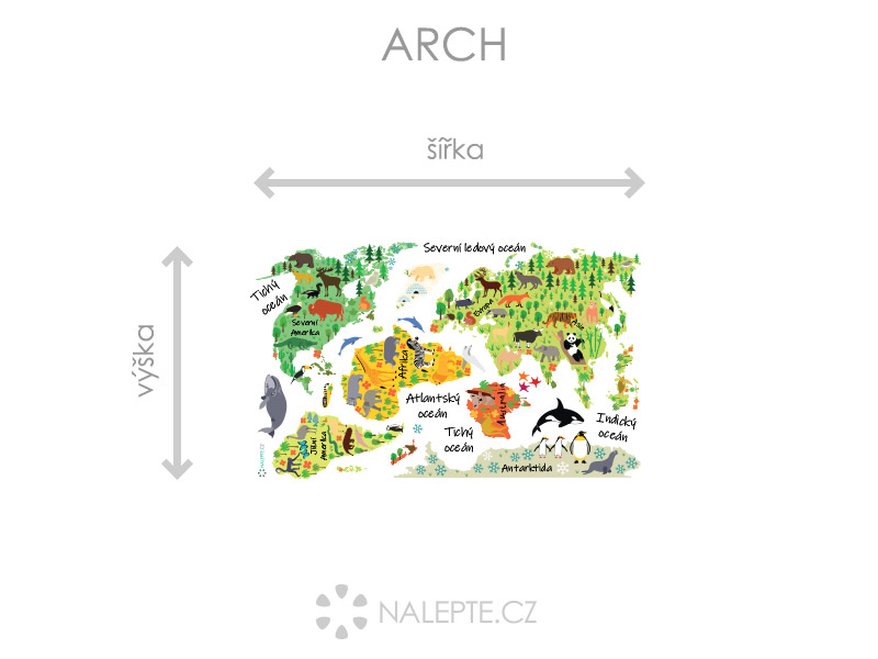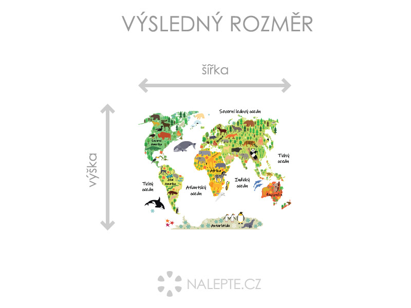Volíte veºkosť výposledné samolepky na stene viď hlavní fotografie. Arch, ktorý obdríte si môzete prehliadédĶ vo fotogalérii. Pri použití hárchu v príslušné ve kos odpovedídá výposledný rozmer podºa náhladového obrásku takto (šírka x výška): a) hárok 71 x 43 cm = výposledný rozmer 75 x 59 cm b) hárok 105 x 63 cm = výposledný rozmer 110 x 87 cm c) hárok 130 x 79 cm = výposledný rozmer 122 x 109 cm d) hárok 158 x 96 cm = výposledný rozmer 165 x 130 cm Samolepky na stenu mapa sveta sa zvírátky je ideální samolepící dekorácia vhodná pre každý detský izba. Ide o pesté a farebné nálepky, ktoré zároveň slúí ako skvelý vzdelávací nástroj. Každý kontinent je bohato zdobenýý roztomilími zvírátky, ktoré symbolizují jeho charakteristickú faunu. A čo je najlepšiacute;? Všetky názvy sú v češtine, takže vaše dia‚tko sa m\u00e2a uči'a zemepis a prírodopis touto zábavnou formou.