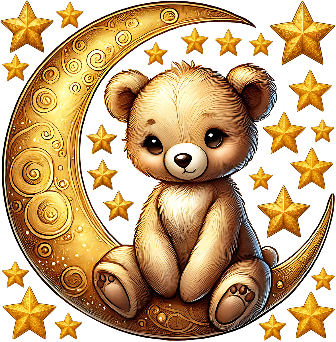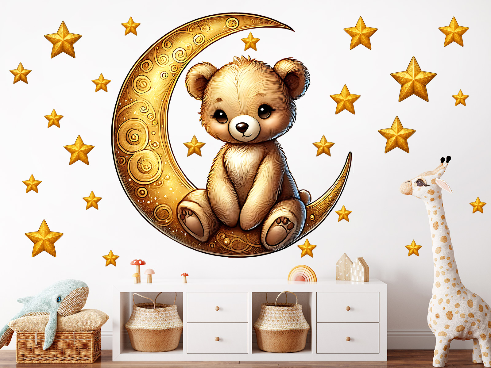 Vytvorte z detskej izby kúzelneé místo plné snov a pohody. Sada samolepiek Medvedík na mesiacuci vnesie do interiéru jemnos», svetlo a pohákovú atmosféru, ktorú si zamilujúí deti aj rodičia. Roztomilý medvídok sedící na zlatém mesíci, obklopený hviezdičkami, pôsobí hrejivo, pokojne a dokonale ladí s interiérmi v prírodních i pastelových tónoch. Čo sada obsahuje:- 1× velký motív medvediaka na mesiacu- 20× hviezdičiek rôznychých veľkosťí pre ľubovoľneé rozmístení Možnos vytvori vlastní hvezdneé nebo podľa veľkosti steny Díky samostatním hviezdičkám môžete scénu prispôsobi ako menší steny u postýlky, tak aj celé stene nad detskú posteľí.