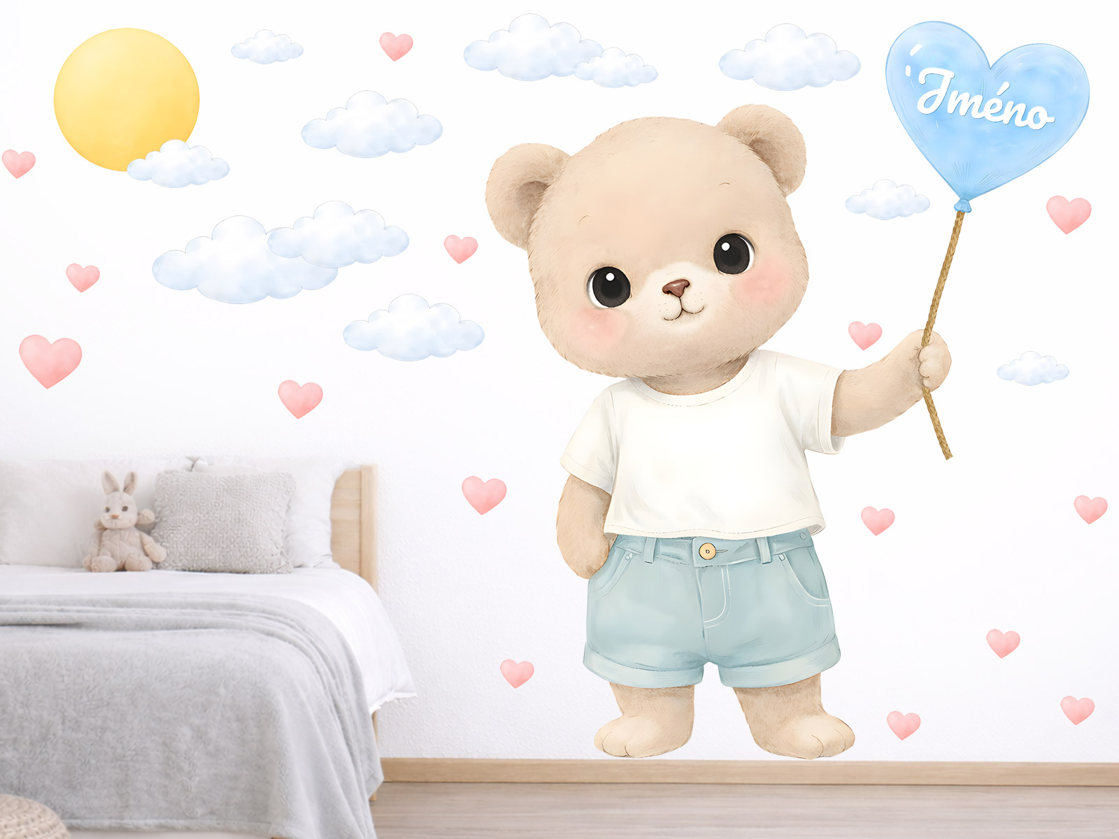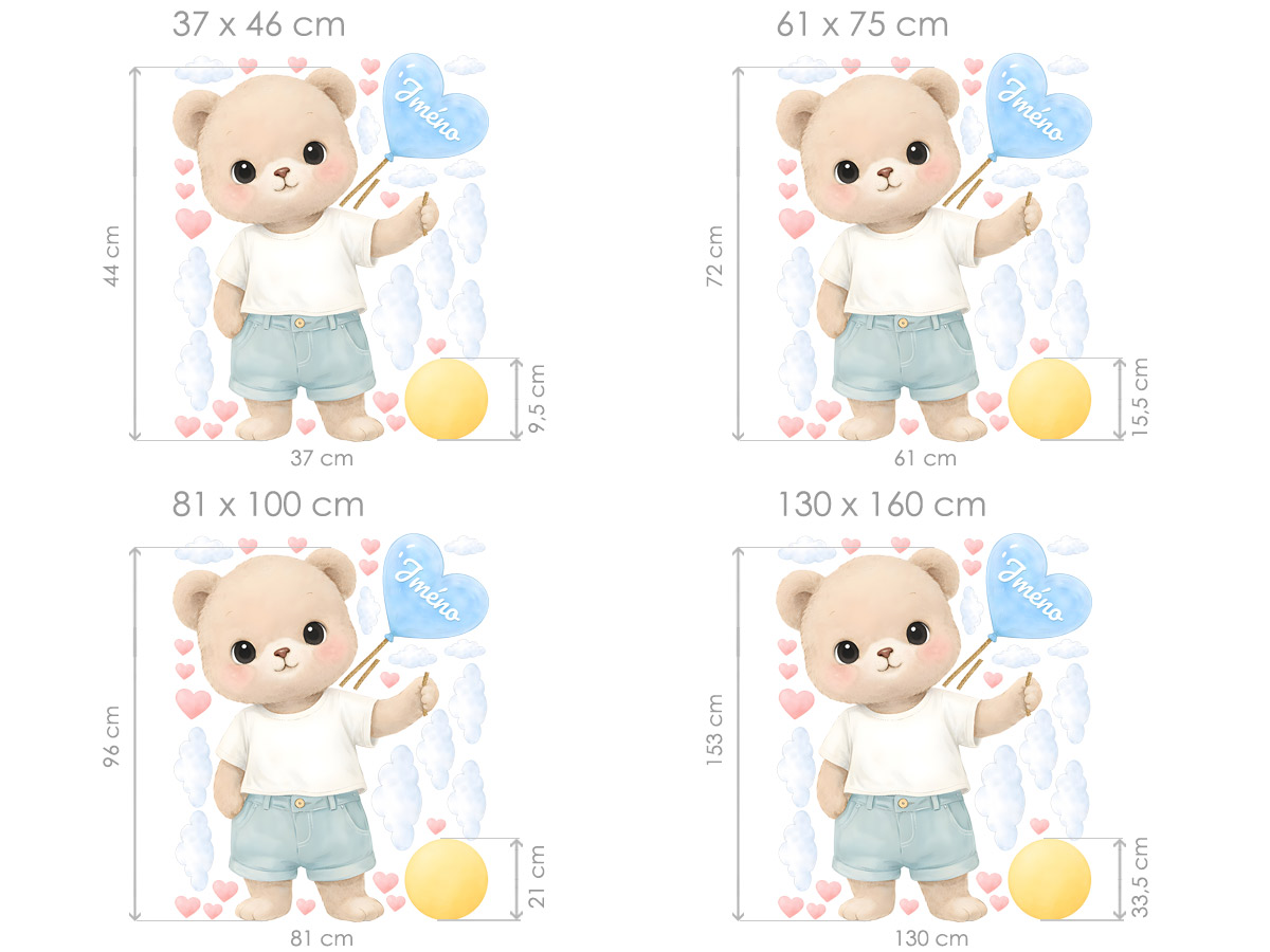 Meno podľa želania v srdiečku-balóniku môže byť uvedené samostatne alebo v kombinácii s dátumom narodenia či napríklad vekom (tento údaj bude zarovnaný na stred pod menom v druhom riadku). Text zadajte v 3. kroku objednávky do poľa „poznámka“. Ak máte špeciálne želanie, kontaktujte nás: info@nalepte.cz. Samolepka na stenu Medvedík s balónikom a menom je nežnou a osobnou dekoráciou, ktorá dodá detskej izbičke jedinečný charakter. Roztomilý medvedík s veľkými očami a jemným výrazom pôsobí veľmi prívetivo a vytvára príjemnú, upokojujúcu atmosféru. Medvedík drží balón v tvare srdca, do ktorého je možné doplniť meno dieťaťa, čím sa dekorácia stáva krásnym personalizovaným prvkom. Okolo sa vznášajú jemné obláčiky, srdiečka a slniečko, ktoré celú scénu dopĺňajú o hravý a láskyplný nádych. Pastelové farby a akvarelový štýl zaisťujú, že samolepka skvele zapadne do moderných aj klasických detských interiérov. Jednotlivé prvky je možné rozmiestniť podľa vlastného priestoru a vytvoriť tak originálnu kompozíciu na mieru. Ideálna dekorácia pre bábätká aj malé deti, ktorá spája roztomilý dizajn s osobným detailom a vytvorí v izbičke pocit tepla a bezpečia.