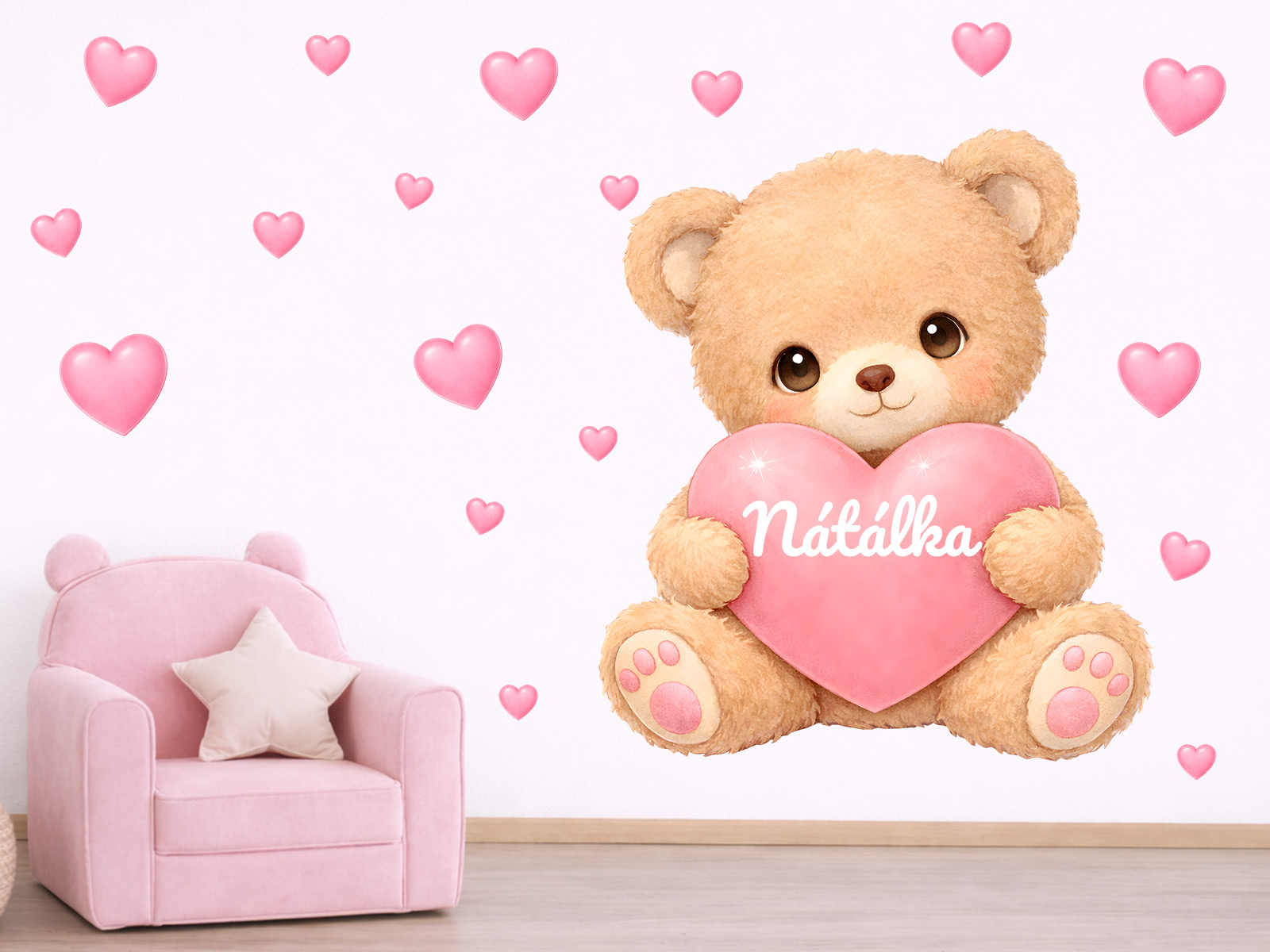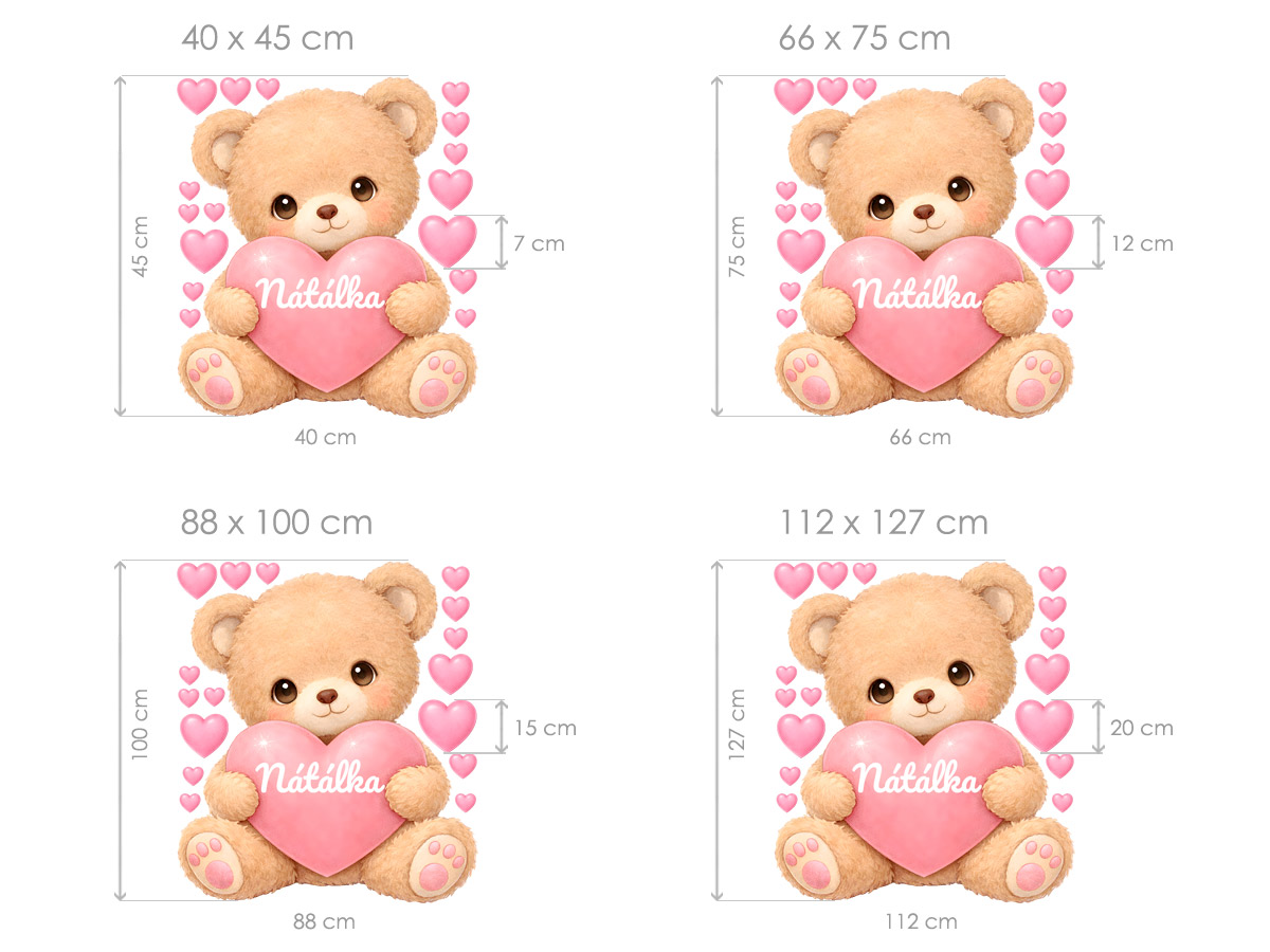 Meno na prání v srdíčku je mo|né samotné alebo kombinovať s dátumom narodenia. alebo napríklad vekom (tento údaj bude vycentrován pod jménom v druhém riadku). Text zadajte v 3. kroku objednávky do pola "poznámka". Ak máte speciální prání kontaktujte nás: info@nalepte.sk. Bude Vám zaslaán náhlad na schálení emailom. Samolepka na stenu &Medvídek so srdíčkom a menom“ vnesie do detskej izby hrejivú atmosféru plnú nehy a radosti. Roztomilý medvídek s jemným, mäkk&´m výrazom drží ružové srdíčko s vlastním jménom diaíte, okolo neho sa vznášají drobná srdíčka, ktorá dotvárejí pocit lásky, bezpečí a pohody. Ilustrácia je ladená. do jemných pastelových tónov, pôsobí priátelsky a harmonicky a krásne zapadne do diaí vrátane i chlapeckej izby. Arch obsahuje hlavní motív medvedíka s menom a doplnkami; srdíčka, diaíky ktorým si je mo|no vytvori vlastní rozložení na stene a dodať priestoru osobitý, hravý charakter. Samolepka je ideální ako originální dekorácia nad postýlku, k hracímu kútiku alebo ako milý dárek k narodení bábätká či narodeninám.