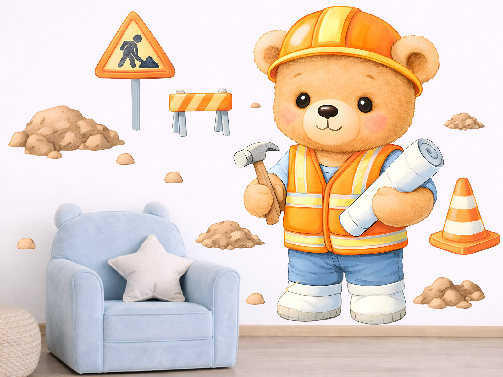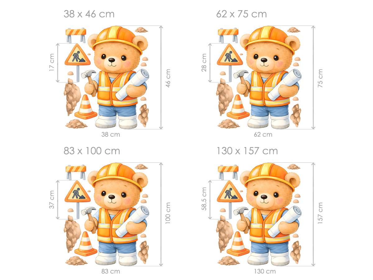 Nálepky na stenu Builder Bear vnesú do detskej izby hravú atmosféru plnú fantázie a dobrodružstva. Roztomilý medvedík v pracovnom odeve, s prilbou a náradím, vyzerá priateľsky a povzbudivo a ľahko upúta pozornosť každého malého staviteľa. Ilustrácia je vyhotovená v jemných, veselých farbách, ktoré rozžiaria izbu, bez toho aby rušili. Nálepka je ideálna do detskej izby, herne alebo detského kútika a podnecuje detskú fantáziu, hru a záujem o objavovanie sveta okolo seba. Vďaka výberu veľkostí sa dá ľahko prispôsobiť menším priestorom, ako aj väčším stenám nad posteľou alebo herným kútikom, kde sa medvedík staviteľ stane nepostrádateľným priateľom na každý deň.