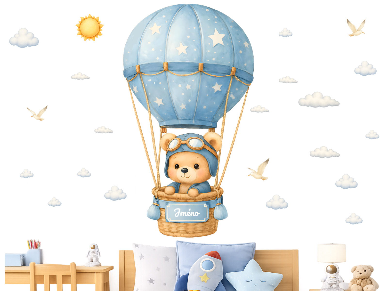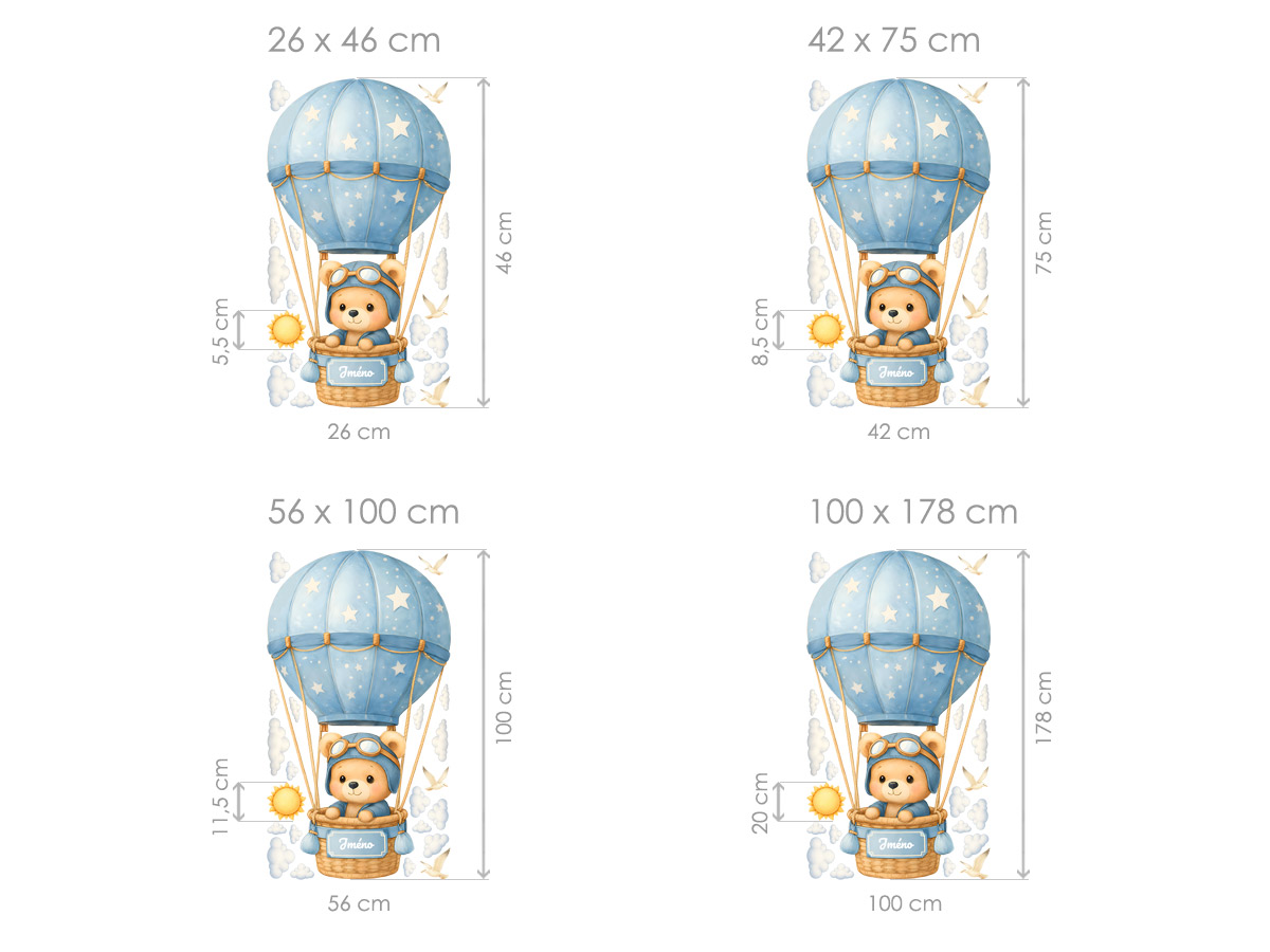 Názov na nápise na koši horúcovzdušného balóna môže mať dĺžku až 12 znakov. Text zadajte v kroku 3 objednávky do poľa „poznámka“. Ak máte akékoľvek špeciálne požiadavky, kontaktujte nás na adrese info@nalepte.cz. Táto jemná detská nálepka s roztomilým medvedíkom letiacim v teplovzdušnom balóne premení izbu vášho dieťaťa na miesto plné snov a fantázie. Vďaka možnosti pridať meno na košík balóna sa stáva personalizovanou dekoráciou, ktorá poteší každé dieťa a dodá izbe jedinečný charakter. Ilustrácia v jemných pastelových farbách s oblakmi, vtákmi a slnkom pôsobí pokojne a harmonicky, ideálne nad detskú postieľku alebo do kútika na hranie. Nálepka je navrhnutá tak, aby krásne vynikla sama o sebe alebo v kombinácii s inými prvkami a aby rástla spolu s detskou izbou.