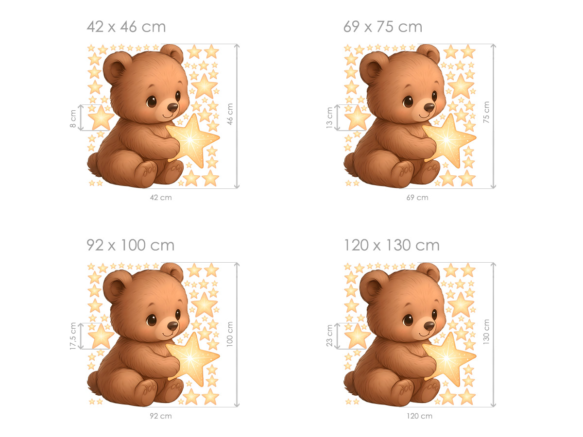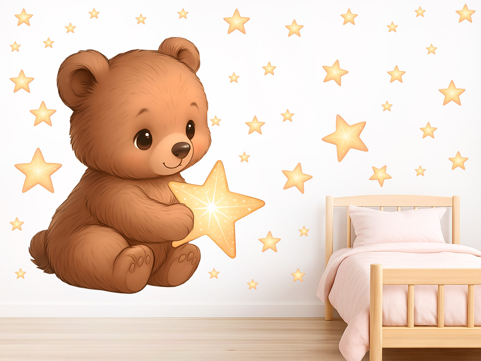 Nálepky na stenu s medvedíkom a hviezdičkami vnášajú do detskej izby pokojnú, útulnú a rozprávkovú atmosféru. Roztomilý medvedík držiaci žiarivú hviezdičku pôsobí nežne a bezpečne, čo je ideálne pre priestor určený na odpočinok a spánok. Motív dopĺňa množstvo drobných hviezdičiek, ktoré vytvárajú dojem nočnej oblohy plnej svetielok. Celý dizajn pôsobí veľmi upokojujúco a pomáha navodiť príjemnú večernú atmosféru. Táto dekorácia sa skvele hodí nad detskú postieľku alebo posteľ, kde vytvorí útulné a pokojné prostredie. Ideálna voľba pre bábätká aj menšie deti, ktorým pomôže cítiť sa v izbičke bezpečne a spokojne.