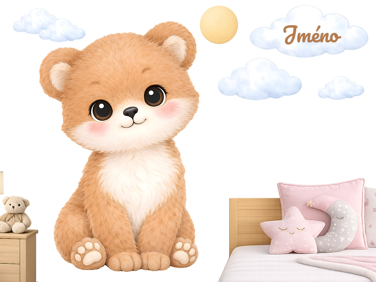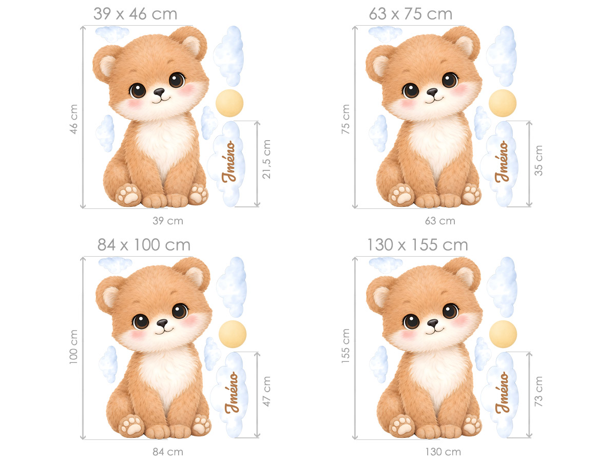 Meno na obláčiku môže byť uvedené samostatne alebo v kombinácii s dátumom narodenia či napríklad vekom (táto informácia bude zarovnaná na stred pod menom v druhom riadku). Je možné vyrobiť aj bez mena. Text zadajte v 3. kroku objednávky do poľa „poznámka“. Ak máte špeciálne požiadavky, kontaktujte nás: info@nalepte.cz. Nálepky na stenu s medvedíkom a menom sú krásnou a jemnou dekoráciou, ktorá v detskej izbičke vytvorí pocit tepla, bezpečia a pohody. Roztomilý medvedík s veľkými očami a jemným úsmevom pôsobí veľmi priateľsky a upokojujúco. Motív dopĺňajú obláčiky a slniečko v jemných pastelových odtieňoch, ktoré dodávajú celej kompozícii ľahkosť a harmóniu. Miesto na meno na obláčku umožňuje vytvoriť originálnu a personalizovanú dekoráciu presne na mieru. Vďaka svojmu univerzálnemu dizajnu sa hodí do chlapčenskej aj neutrálnej detskej izby. Ideálne je umiestnenie nad posteľ, detskú postieľku alebo do kútika na hranie, kde pomôže vytvoriť útulné a láskyplné prostredie.