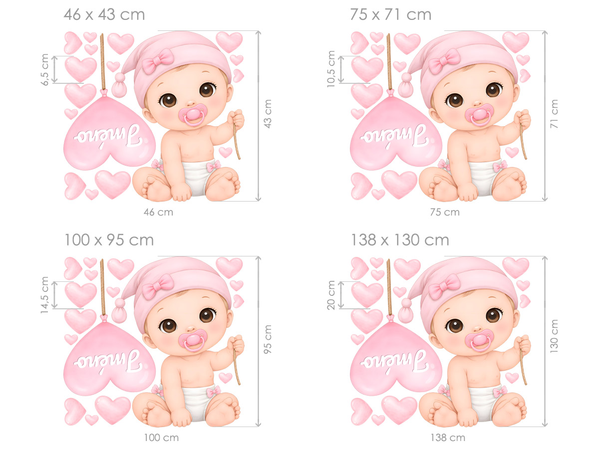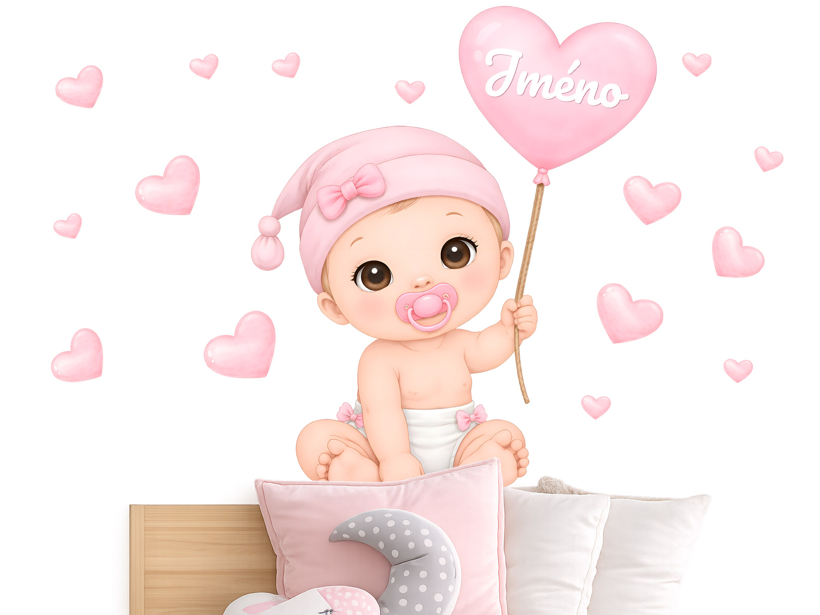 Meno na želanie v srdiečku môže byť uvedené samostatne alebo v kombinácii s dátumom narodenia či napríklad vekom (tento údaj bude zarovnaný na stred pod menom v druhom riadku). Text zadajte v 3. kroku objednávky do poľa „poznámka“. Ak máte špeciálne želanie, kontaktujte nás: info@nalepte.cz. Nálepky na stenu Dievčatko s menom sú jemnou a originálnou dekoráciou, ktorá dodá detskej izbe jemnú a láskyplnú atmosféru. Roztomilé bábätko v pastelových ružových odtieňoch drží srdiečkový balónik s menom, čím vzniká krásny personalizovaný prvok. Motív dopĺňajú drobné srdiečka, ktoré pôsobia hravým a zároveň upokojujúcim dojmom. Celý dizajn je ladený do jemných farieb, ktoré vytvárajú príjemné prostredie ideálne pre bábätká. Dekorácia sa skvele hodí nad detskú postieľku alebo do detského kútika, kde vytvorí útulnú a harmonickú atmosféru. Vďaka možnosti doplnenia mena sa stáva aj krásnou spomienkou a jedinečným doplnkom každej detskej izby.