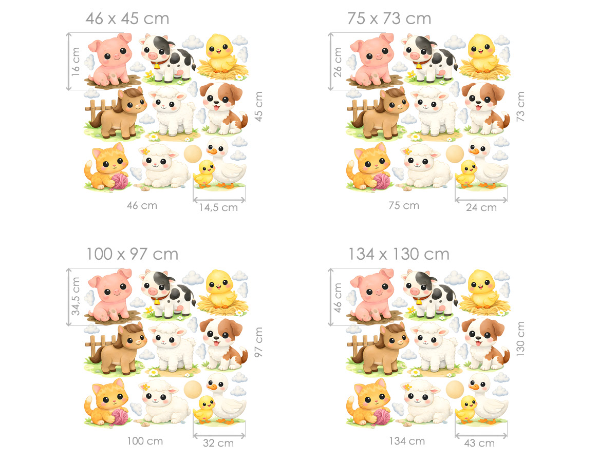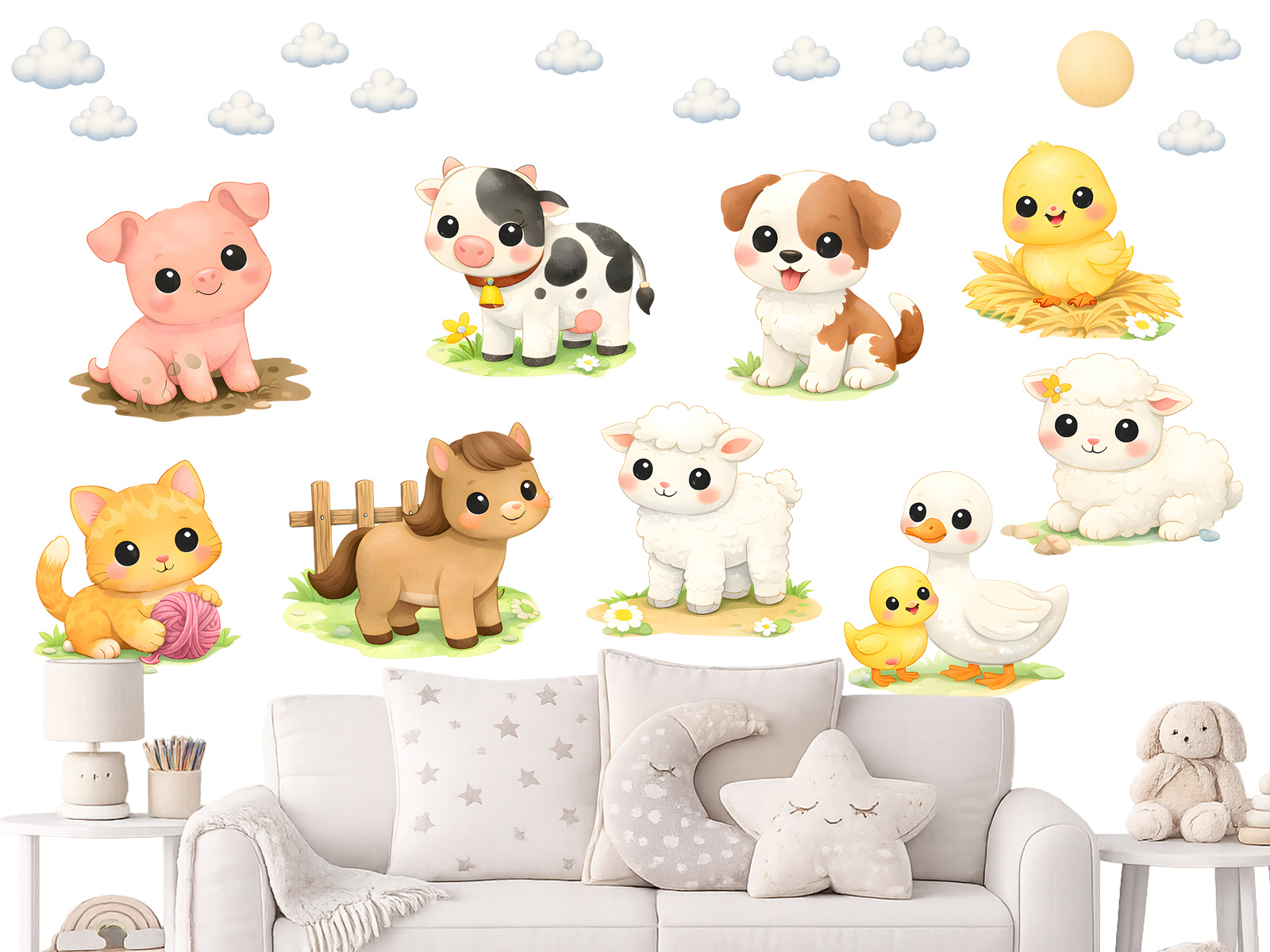 Nálepky na stenu „Mláďatá z farmy“ vnesú do detskej izby veselú vidiecku atmosféru plnú roztomilých zvieratiek. Ilustrácie malých farmárskych mláďat pôsobia milo a priateľsky, takže okamžite vytvoria hravú a útulnú dekoráciu. Na motíve nájdete rôzne zvieratká z farmy – prasiatko, kravičku, psíka, ovečku, mačiatko, žriebä, kuriatko aj husu s malým húsatkom. Celú scénu dopĺňajú drobné detaily, ako sú obláčiky, slniečko alebo kvietky, ktoré dekorácii dodávajú jemný a radostný charakter. Táto dekorácia je ideálna do detskej izby, izby pre bábätko alebo do kútika na hranie. Roztomilé zvieratká z farmy vytvoria príjemnú atmosféru plnú pohody a fantázie a premenia izbu na malú veselú farmu.