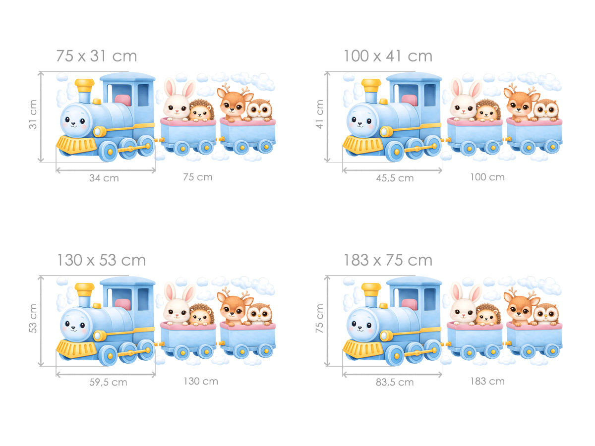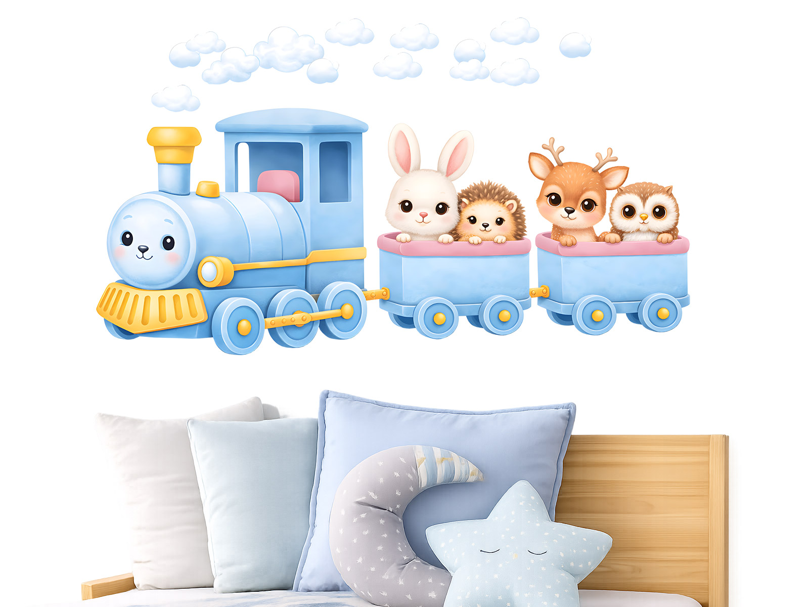 Samolepka na stenu Modrý vláčik pre deti je krásnou a hravou dekoráciou, ktorá rozžiari každú detskú izbičku. Jemné pastelové farby v kombinácii s roztomilými zvieratkami vytvárajú upokojujúcu a priateľskú atmosféru ideálnu pre malé deti. Vláčik v modrých tónoch sprevádzajú milí kamaráti – králiček, ježko, srnček a sovička – ktorí vykukujú z vagónikov a pôsobia veľmi nežne a prívetivo. Celý motív dopĺňajú ľahké obláčiky, ktoré dodávajú kompozícii vzdušnosť a rozprávkový nádych. Vďaka textilnému materiálu sú samolepky ľahko aplikovateľné bez bublín a je možné ich kedykoľvek znovu prelepiť alebo presunúť. Sú vhodné aj na jemné povrchy a pri odstránení nezanechávajú poškodenie múru. Jednotlivé časti je možné rozmiestniť podľa vlastného priestoru, takže si vytvoríte originálnu scénu presne podľa vašich predstáv. Ideálna voľba pre všetky deti, ktoré milujú zvieratká, vláčiky a jemný, harmonický dizajn.