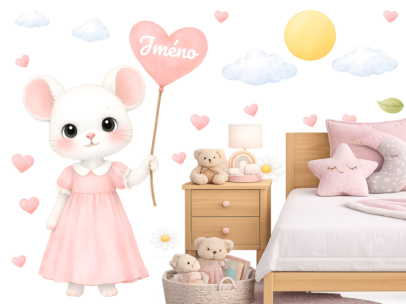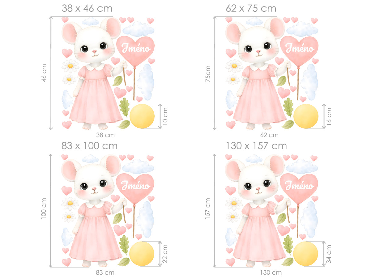 Meno na prianie v srdiečku-balóniku je možné samotné alebo kombinovať s dátumom narodenia alebo napríklad vekom (tento údaj bude vycentrovaný pod menom v druhom riadku). Text zadajte v 3. kroku objednávky do poľa "poznámka". Ak máte špeciálne prianie kontaktujte nás: info@nalepte.cz. Nálepky na stenu „Myška s balónikom a menom“ sú jemnou a originálnou dekoráciou, ktorá detskej izbe dodá čarovnú atmosféru. Roztomilá myška v jemných pastelových odtieňoch drží balónik v tvare srdca, do ktorého je možné umiestniť meno dieťaťa, čím vzniká krásny personalizovaný prvok. Motív dopĺňajú drobné srdiečka, kvietky, lístočky, obláčiky a slniečko, ktoré spolu vytvárajú harmonickú a hravú scénu. Celkový vzhľad pôsobí veľmi jemne, upokojujúco a skvele zapadne do detského interiéru. Táto dekorácia je ideálna nad detskú postieľku alebo posteľ, kde vytvorí milé a útulné prostredie. Vďaka personalizácii sa navyše stáva krásnym doplnkom aj spomienkou, ktorá dodá izbe jedinečný charakter.