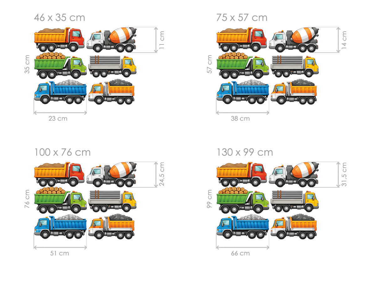 Samolepka na stenu „Náklaďáčky“ priáší do detského izby pestrý svet pracovních vozidiel, ktorá sú pripravené prevážať prísek, šterk, drevo i stavební materiál. Sada obsahuje niekoπko rôznychích nákladních áut v hravém, detailne spracovaém ilustratívnom ím štýle, diaíky čomu si deti môžu jednotlivé vozidlá rozmísti† poda vlastní fantázie a vytvoriť si na stene vlastní malé stavanie&scarón;te alebo dopravní scénu. Farebneé vykonaní a priátelský vzhľad áut podporujejí hravú atmosféru a prirodzene podnecují detskú predstavivos•, zájem o techniku aj vyprávení vlastních príbehov. Samolepka je ideální voľbou pre všetky malé fanúšikov áut, stavieb a dopravy a stane sa výrazným a zábavným prvkom každého detského interiéru.