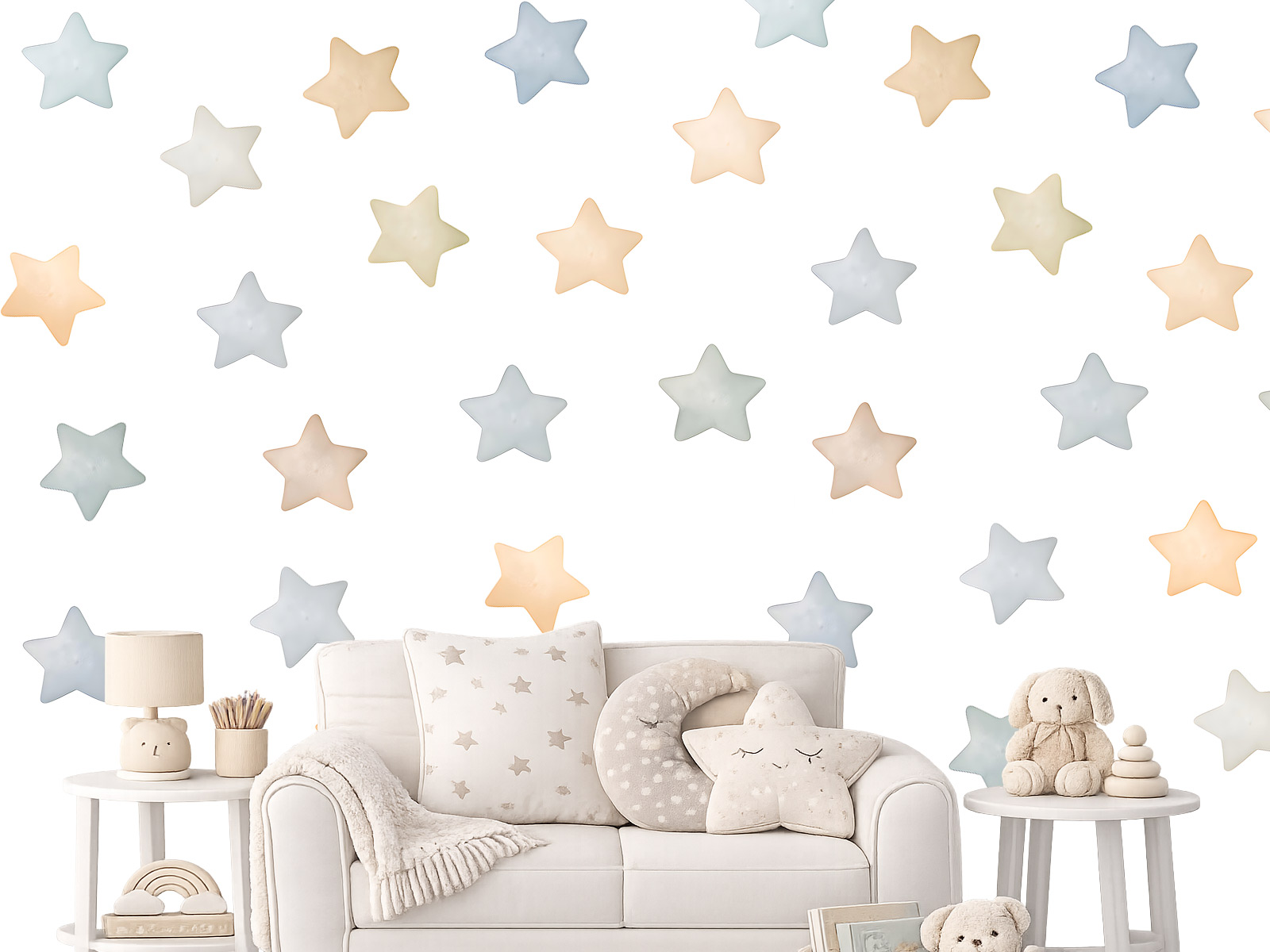 Nálepky na stenu Nordic akvarelové hviezdičky 50 ks sú jemnou a modernou dekoráciou do detskej izby, inšpirovanou obľúbeným škandinávskym štýlom. Kombinácia tlmených odtieňov modrej, šedej, béžovej a jemnej pieskovej farby vytvára harmonickú farebnú paletu, ktorá pôsobí pokojne, elegantne a nadčasovo. Vďaka akvarelovému efektu majú hviezdy jemné farebné prechody a vyzerajú, ako keby boli ručne maľované. Táto dekorácia je ideálna do svetlých detských izieb s drevom, prírodnými materiálmi a minimalistickými doplnkami. Severský štýl je známy svojou jednoduchosťou a prirodzenosťou, takže hviezdy krásne doplnia moderný interiér a vytvoria príjemnú a útulnú atmosféru. Nálepky na stenu si môžete usporiadať podľa vlastnej fantázie. Hviezdy môžete rozmiestniť po celej stene, vytvoriť pravidelný vzor alebo jednoducho pridať jemnú dekoráciu nad detskú postieľku či posteľ. Vďaka tomu ľahko vytvoríte originálnu dekoráciu, ktorá detskej izbe dodá pokojný, štýlový a harmonický vzhľad.