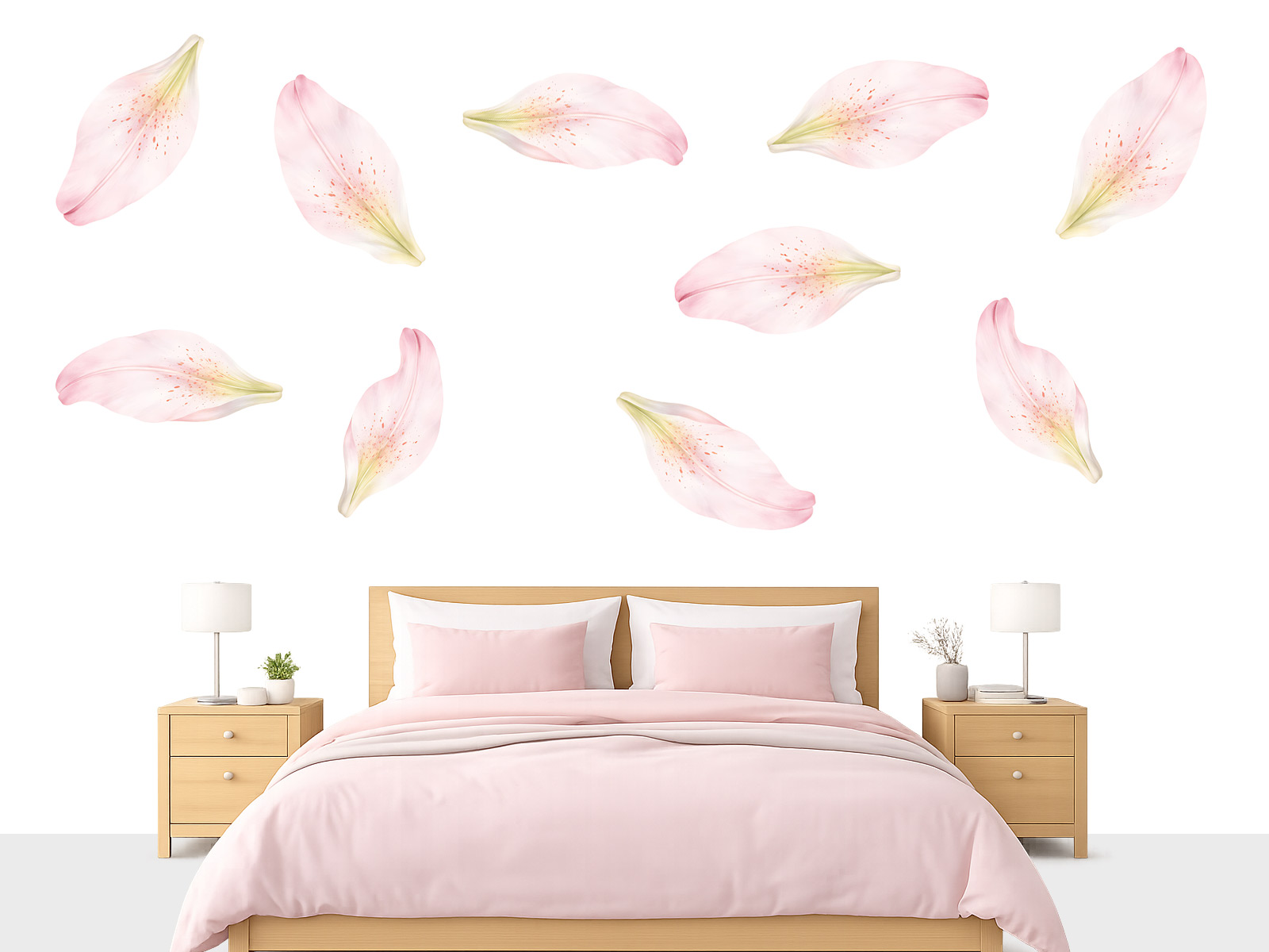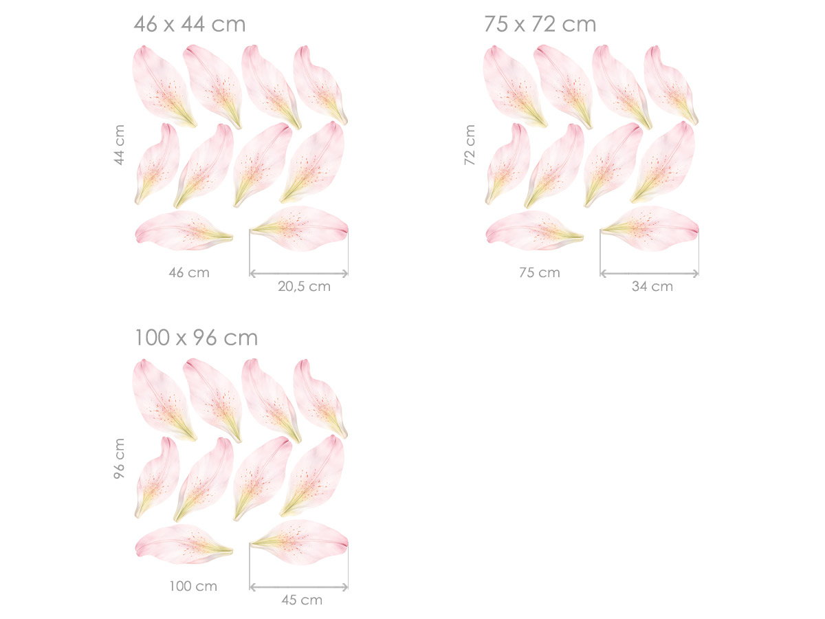 Samolepka na stenu Okvetné lístky ľalie prinášajú do interiéru ľahkosť, jemnosť a romantickú atmosféru. Rozptýlené kvetné lístky v nežných ružových tónoch pôsobia veľmi elegantne a vytvárajú pocit pokoja a harmónie. Akvarelové spracovanie s jemnými farebnými prechodmi dodáva lístkom prirodzený a vzdušný vzhľad. Vďaka ich voľnému rozmiestneniu na stene vzniká efekt ľahkého poletovania, ktorý priestor opticky zjemní a oživí. Samolepky si môžete usporiadať podľa vlastných predstáv, čo umožňuje vytvoriť originálnu dekoráciu presne na mieru danému priestoru. Skvele sa hodí do spálne, obývacej izby alebo dievčenskej izby, kde podčiarknu jemný a útulný štýl. Ideálna voľba pre tých, ktorí chcú svojmu domovu dodať nádych romantiky, sviežosti a prirodzenej elegancie.