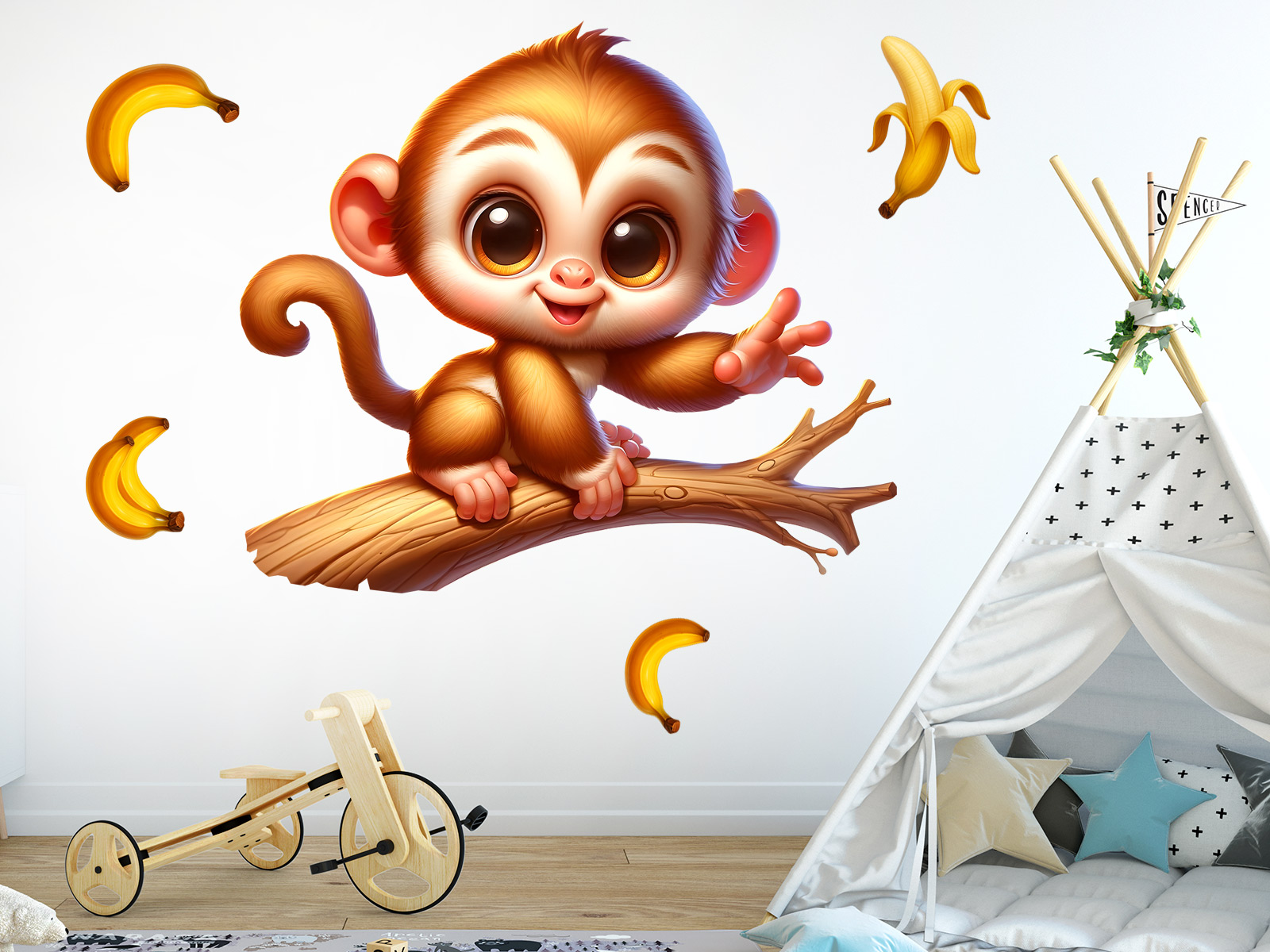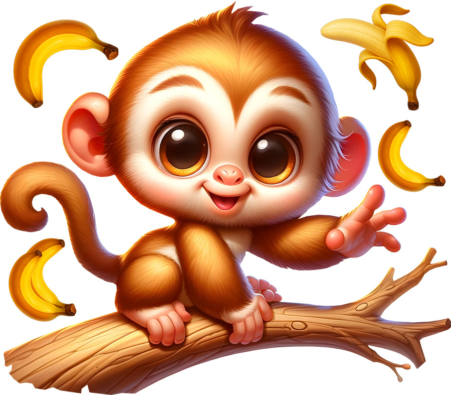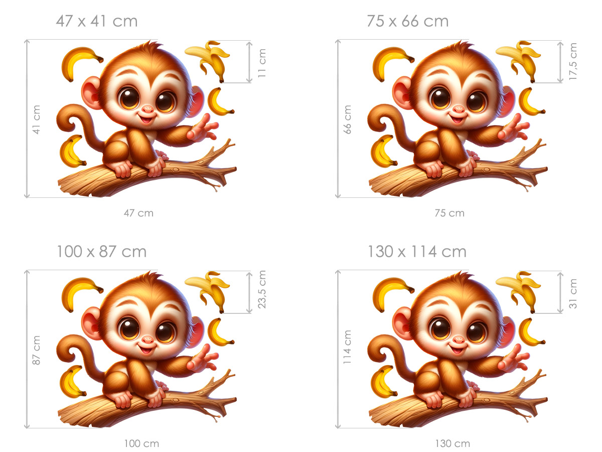 Samolepka na stenu Opička na vetve vnesie do detskej izby hravú radosť, teplo a smiev na tvári pri každom pohľade. Roztomilá opička s veľkýma zvídavýma očami, sedící na vetve a obklopená poletujícími banány, pôsobí priátelsky, naživo a plná energie. Jemné farebné tóny a mäkké tvary vytárejí útulnú atmosféru, ktorá podporuje fantáziu, hravosť aj pocit bezpečí. Motív sa ľahko stane veselým stredobodom miestnosti, nech nad postýlkou, posteí alebo v hracím kútiku, a prirodzene zapadne do moderního aj pohádkového interiéru. Opička na vetve je ideálním spolo&níkom pre malé objaviteľa, ktoí milují zvírátka, dobrodružstvoí a svet plný farieb a úsmevov.