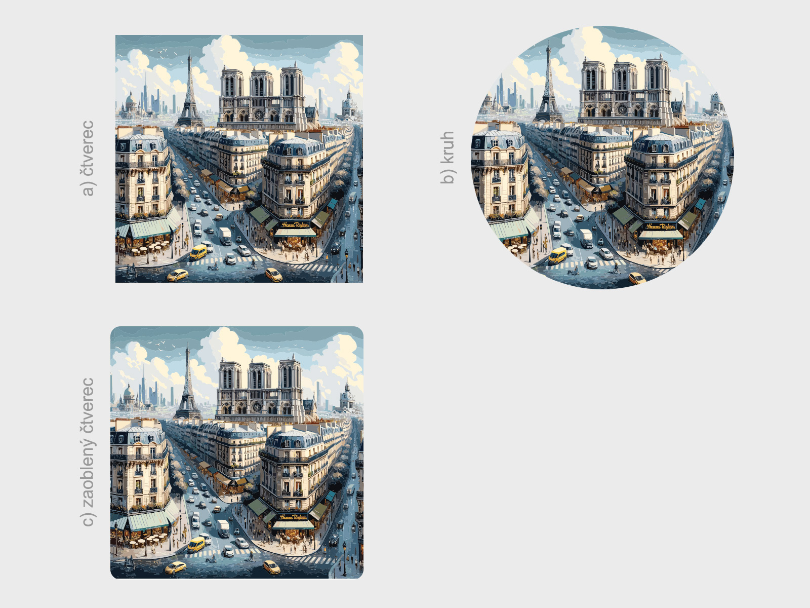 Tvar je možné zmeniť. Možno vybrať a) štvorec, b) kruh, c) zaoblený štvorec viď fotogaléria. Ak teda máte zájem o iný tvar ako na hlavní fotografiu, stačí v posledním kroku objednávky do pola poznámka napísa napr. "štvorec". Jedná sa o tištený samolepící plakát - imitácia maľby Je možné zvoliť aj ľubovoľneý vlastní rozmer hárku pomocí posuvníku alebo klikání na "Vetší", "Menší"