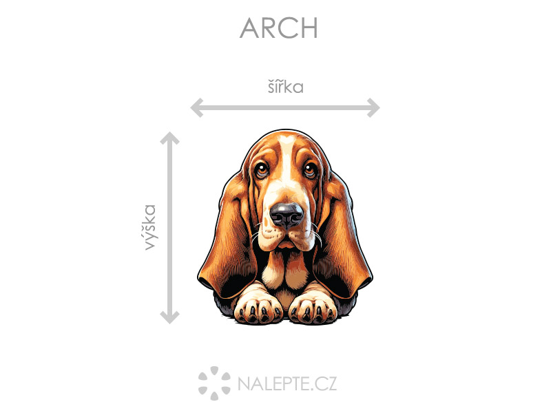 Arch = Arch si môžete prehliadnuť vo fotogalérii. Rozmer archu volíte v objednáke. Prehľad preddefinovaních rozmerov (šírka x výška): a) hárok 18 x 20 cm b) hárok 40 x 45 cm c) hárok 67 x 75 cm d) hárok 90 x 100 cm d) hárok 117 x 130 cm Je možné zvoliť aj ľubovoľneý vlastní rozmer hárku pomocí posuvníku alebo klikání na "Vetší", "Menší" Jedna z mnohých samolepiek psíkov, ktorú sme pre vás zaradili do ponuky. Máte vy alebo niekto vám blíský basseta? Potom mu kúpte túto roztomilú samolepku na stenu ako darček, iste ho poteší, vyrobíme pre vás v ľubovoľneé veľkosti.