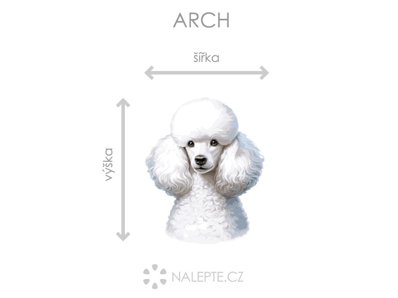 Arch = Arch si môžete prehliadnuť vo fotogalérii. Rozmer archu volíte v objednáke. Prehľad preddefinovaních rozmerov (šírka x výška): a) hárok 16 x 20 cm b) hárok 36 x 45 cm c) hárok 57 x 70 cm d) hárok 81 x 100 cm d) hárok 106 x 130 cm Je možné zvoliť aj ľubovoľneý vlastní rozmer hárku pomocí posuvníku alebo klikání na "Vetší", "Menší" Doplňte svoj domov roztomilou samolepkou na stenu s motívom psa pudla. Tento hravý pudel zútulní akoýkoľvek priestor. Tento malý maznáčik je skvelou voľbou pre všetkých milovníkov psov a jedinečnú dekoráciu; pre vaši domácnos. Jeho roztomilý vzhľad z neho robiaí dokonalý doplnok do chodby, obívacích izieb, kuchyní a dalších míst.