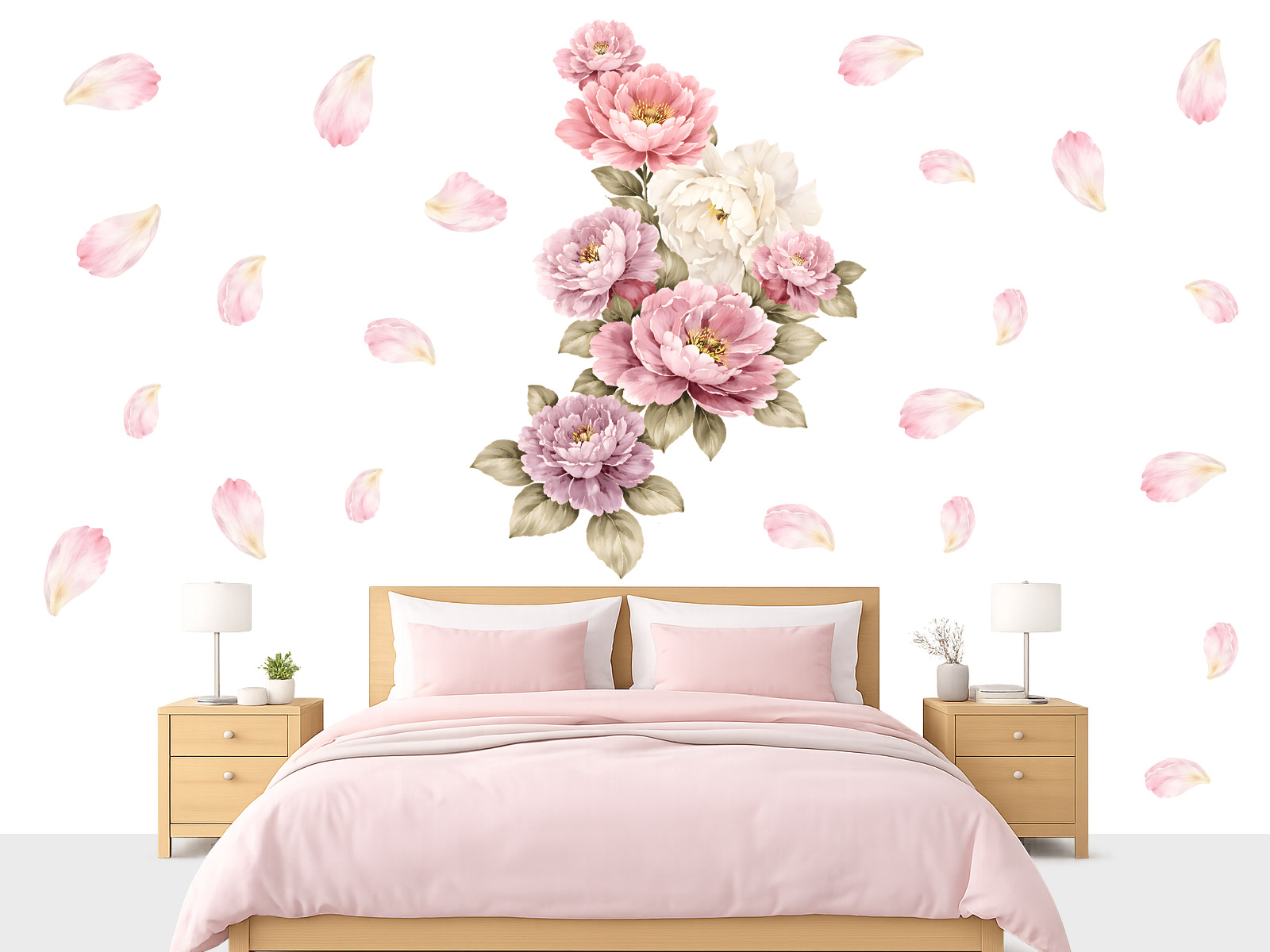 Samolepka na stenu Pivonky prináša do interiéru jemnú eleganciu, romantiku a nadčasovú krásu kvetov. Bohatá kompozícia kvetov v ružových a krémových tónoch pôsobí harmonicky a vytvára výrazný, napriek tomu veľmi nežný dekoratívny prvok. Akvarelové spracovanie zvýrazňuje detailnú štruktúru okvetných lístkov aj prirodzené odtiene farieb, ktoré sa medzi sebou jemne prelínajú. Doplňujúce poletujúce lístky dodávajú celej kompozícii ľahkosť a vzdušnosť. Vďaka centrálnemu usporiadaniu kvetov vzniká efektná dominantná dekorácia, ktorú je možné ľahko umiestniť napríklad nad posteľ alebo pohovku. Samolepka sa skvele hodí do spálne, obývacej izby aj ďalších interiérov, kde chcete vytvoriť pokojnú a útulnú atmosféru. Ideálna voľba pre milovníkov kvetinových motívov, ktorí hľadajú elegantnú a zároveň výraznú dekoráciu s nádychom luxusu.