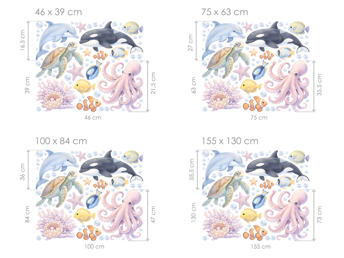 Jednotlivé prvky je možné usporiadať podľa dostupného priestoru tak, aby vytvorili originálnu podmorskú scénu nad posteľou, okolo detskej postieľky alebo na väčšej prázdnej stene. Vďaka rôznym rozmerom si môžete ľahko vybrať variantu, ktorá sa perfektne hodí do vášho interiéru a premení izbu na malý oceán plný snov.