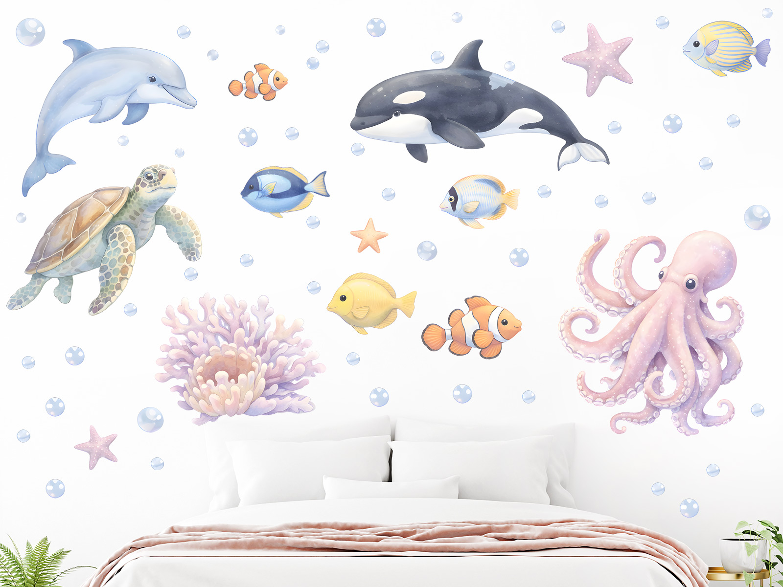 Nálepky na stenu – Podvodný svet prenesie deti do tajomných hlbín oceánu, plných farieb, pohybu a objavov. Delfín, kosatka, morská korytnačka a hravá chobotnica vytvárajú magickú scénu, ktorú dopĺňajú ryby, koraly a jemné bubliny, ktoré dodávajú celej kompozícii ľahkosť a pocit skutočnej podmorskej atmosféry.