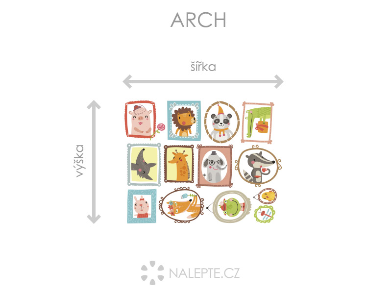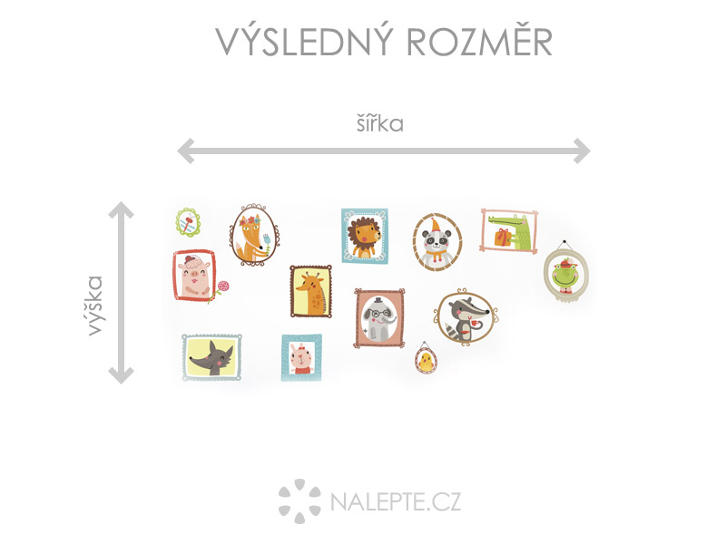 Výposledný rozmer = rozmer po nalepení na stenu podľa hlavní produktové fotografie (samozrejme môžete rozlepiť prvky úplne ľubovoľne a získáte úplne iné výposledné rozmery). Arch = takto vám bude samolepka doručená. Z hárku jednotlivé části odlepíte a nalepíte na stenu tak, aby zložili výposledný motív podľa Vašich predstáv. Arch si môžte prehliada'a vo fotogalérii. Rozmer archu volíte v objednáke. Prehľad rozmerov (šírka x výška): - výposledný rozmer 90 x 37 cm = hárok 45 x 35 cm - výposledný rozmer 150 x 62 cm = hárok 75 x 58 cm - výposledný rozmer 334 x 142 cm = hárok 167 x 130 cm Napríklad výška červeného rámčeka s prasátkom odpovedídá približne jedné tretine výšky hárku.